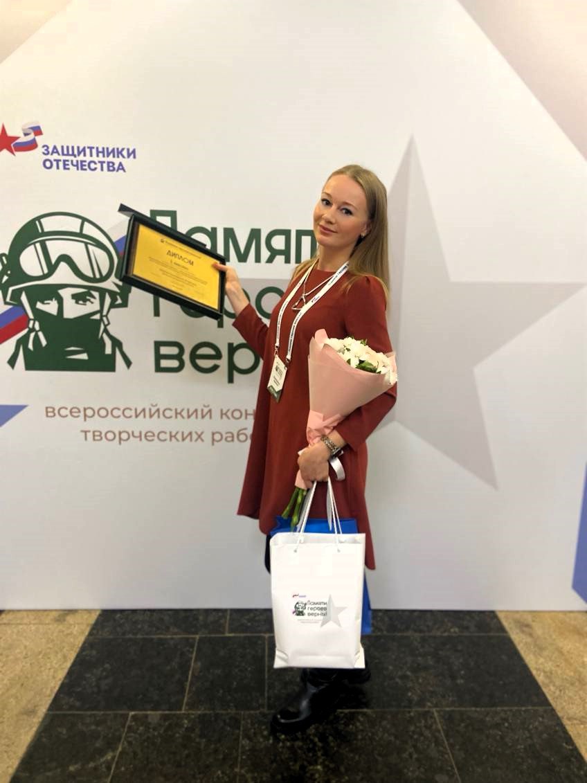 Девушка уже не в первый раз участвует в конкурсе «Памяти героев верны!», который фонд «Защитники Отечества» проводит конкурс уже в третий раз. Так, в 2023 году ее работа была отмечена в номинации «Я в сердце бережно храню», а в 2024 году талант девушки принес ей победу в номинации «Семья Героя».