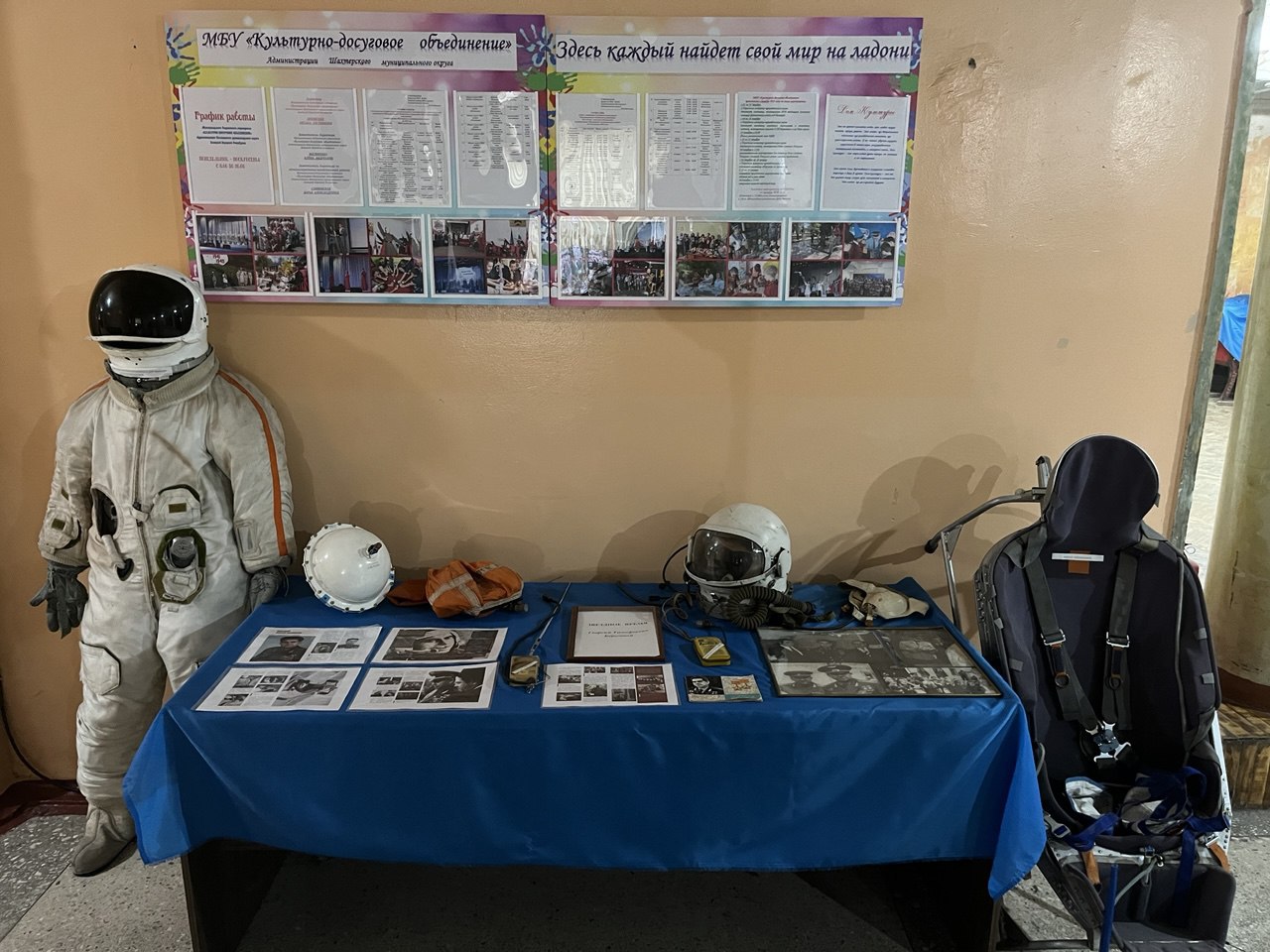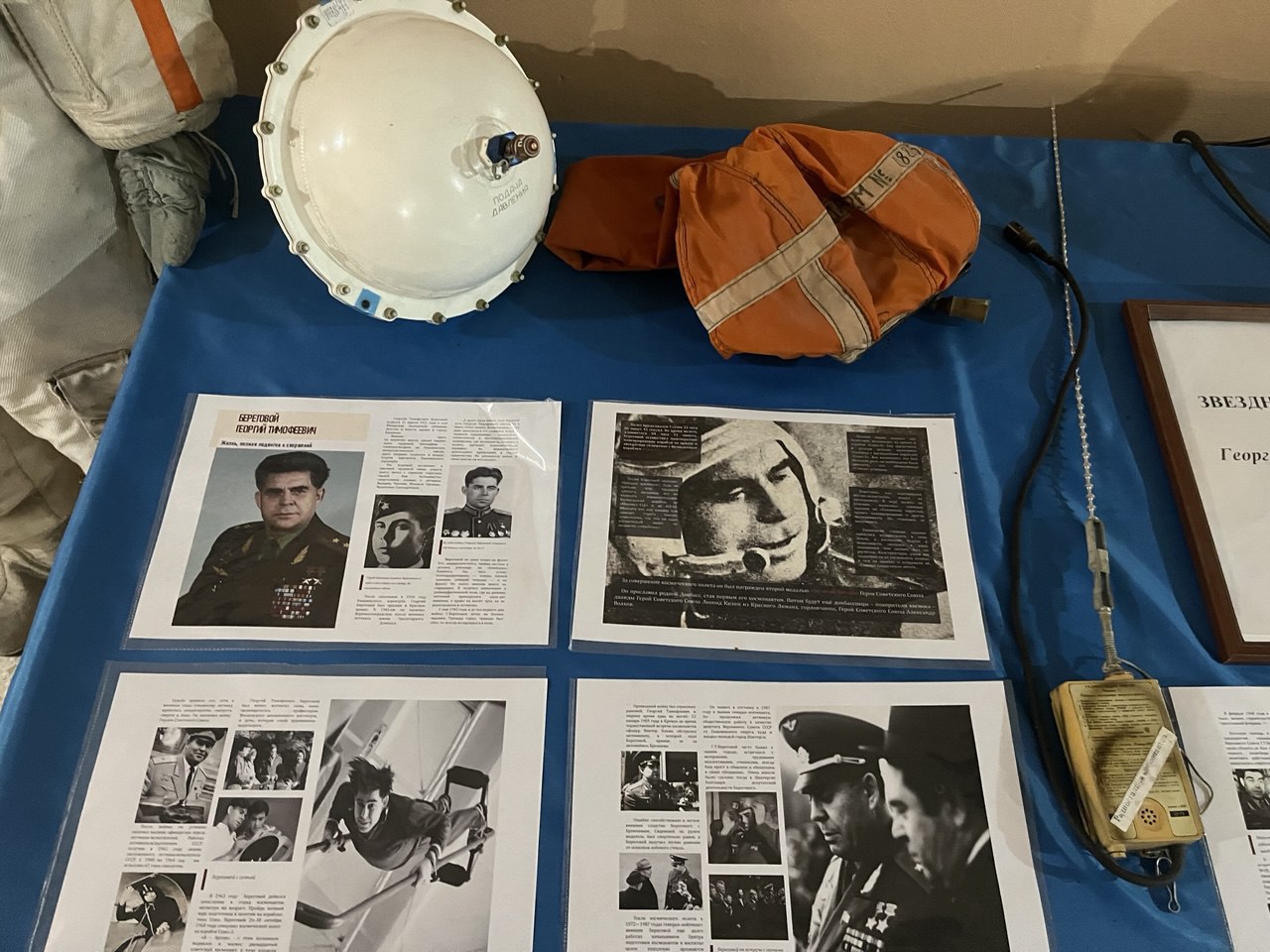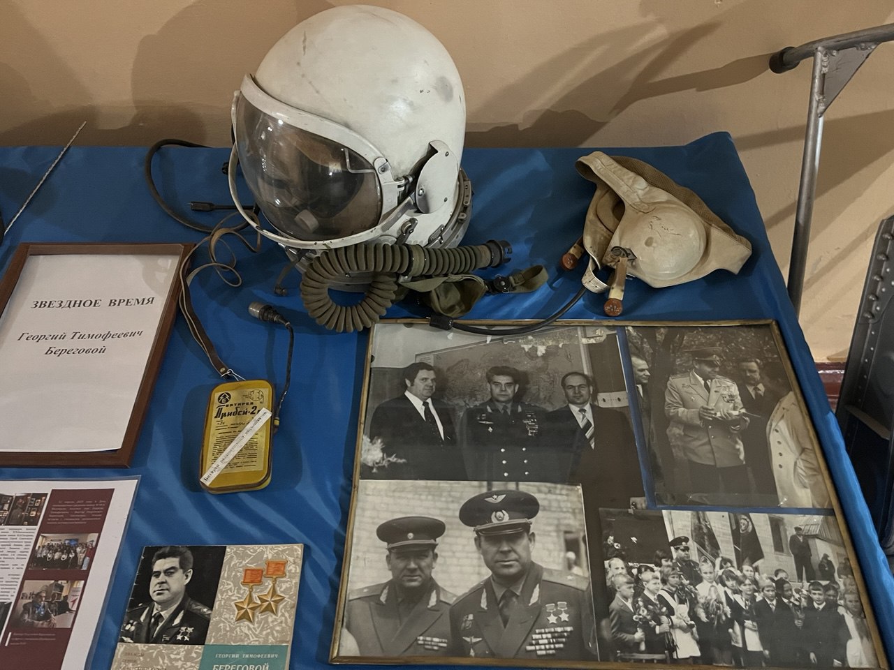 На выставке представлены фотоматериалы по теме, печатные материалы, экспозиция с космическими артефактами, подаренными самим Г.Т. Береговым.