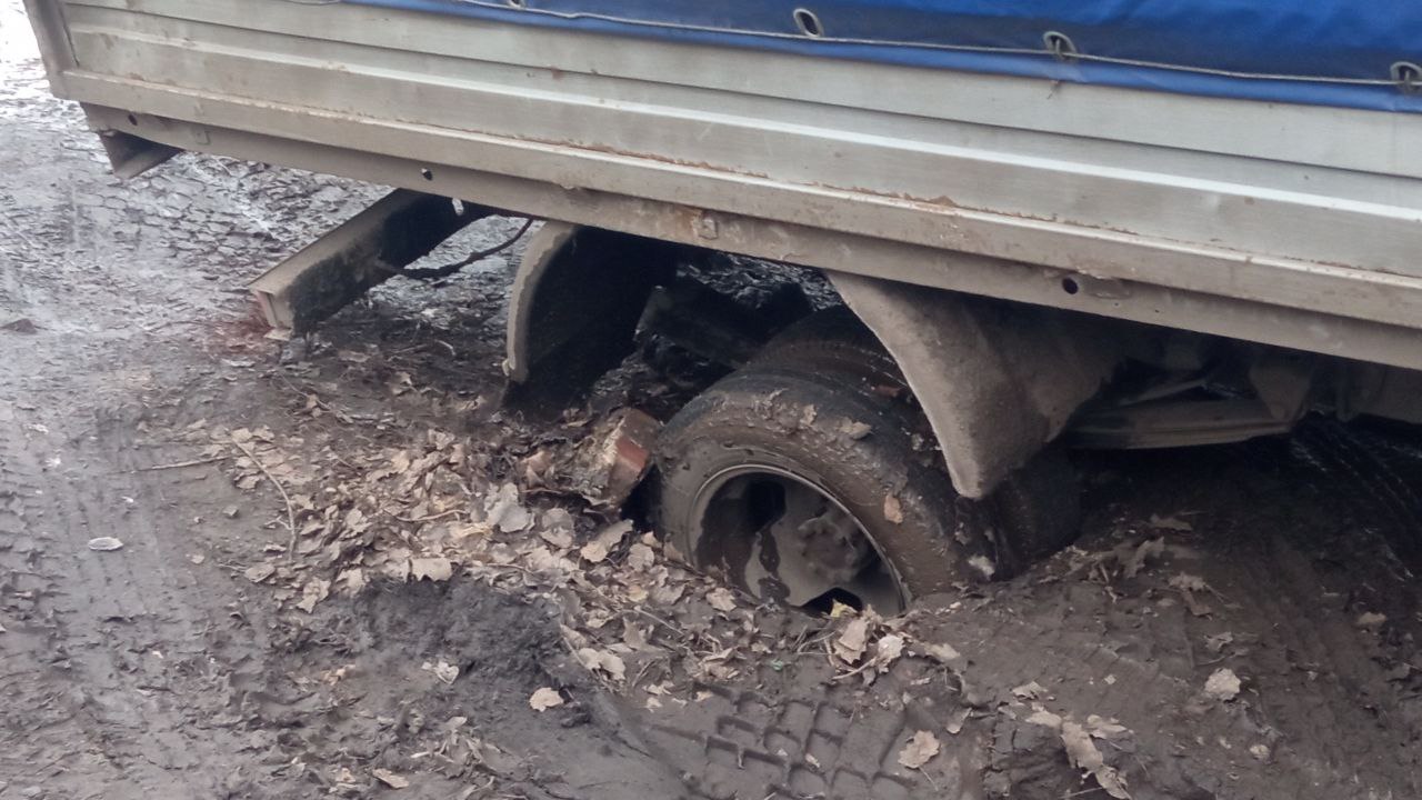 В микрорайоне Ханженково, что в Макеевке, произошёл обидный дорожный инцидент: грузовой автомобиль провалился задними колесами в разрушенный канализационный коллектор.