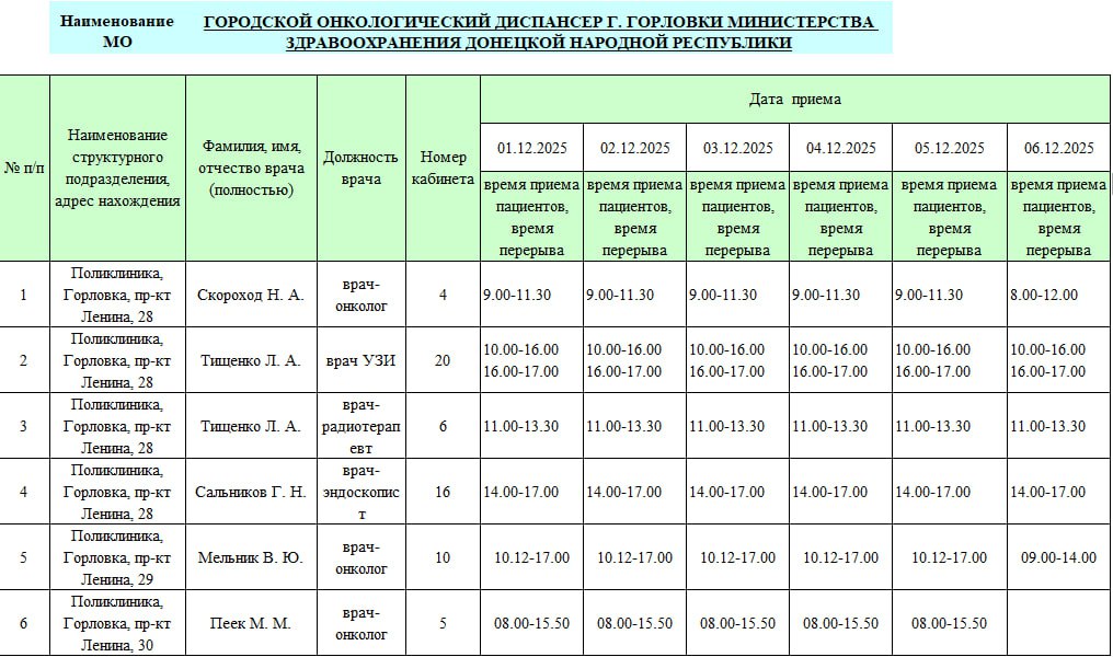 Иван Приходько: График работы специалистов ГБУ ДНР «ГДСП г.Горловки», ГБУ ДНР «Городской наркологический диспансер г. Горловки», ГБУ ДНР «ГПБ г. Горловки», ГБУ ДНР «ГПТД г.Горловки», ГБУ ДНР «ГДВД г.Горловки», ГБУ ДНР «ГСП...
