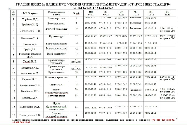 График приема пациентов узкими специалистами ГБУ ДНР "Старобешевская ЦРБ"
