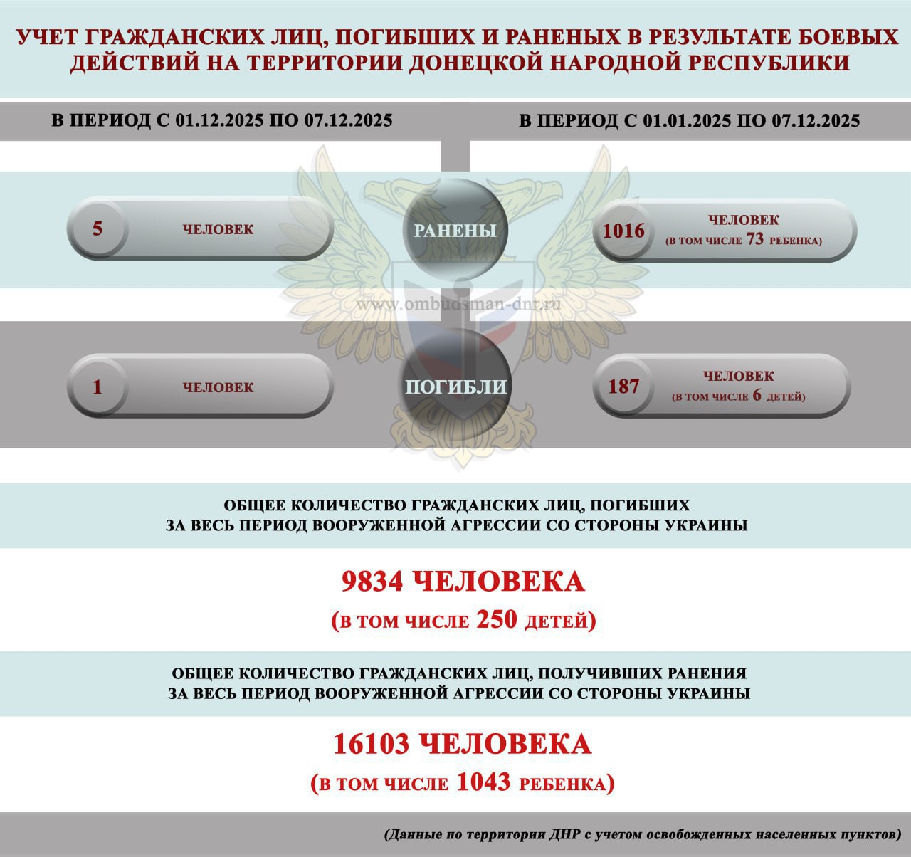 За прошедшую неделю с 1 по 7 декабря ДНР в результате обстрелов ВСУ погибли 1 мирный житель, ранения получили 5 мирных жителей.