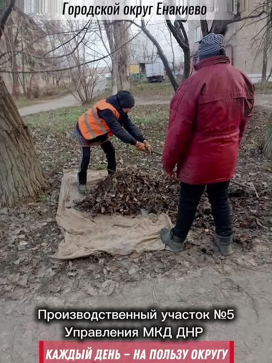 уборка придомовой территории от мусора и листвы:ул. Луганское шоссе, д. 1/15, ул. Толбухина, д. 12, 14, пл. Бурмистрова, д. 4, 6, пр. Горняков, д. 13, ул. Баха, д. 12, ул. Октябрьская, д. 29;
