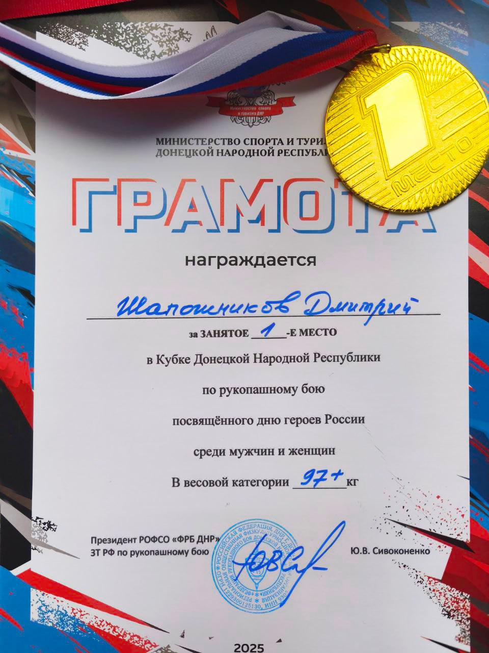Младший судебный пристав по обеспечению установленного порядка деятельности судов отделения специального назначения ГУФССП России по Донецкой Народной Республике Дмитрий Шапошников занял первое место на Кубке Донецкой Народной Республики по рукопашному бою. Турнир был посвящён Дню Героев России.