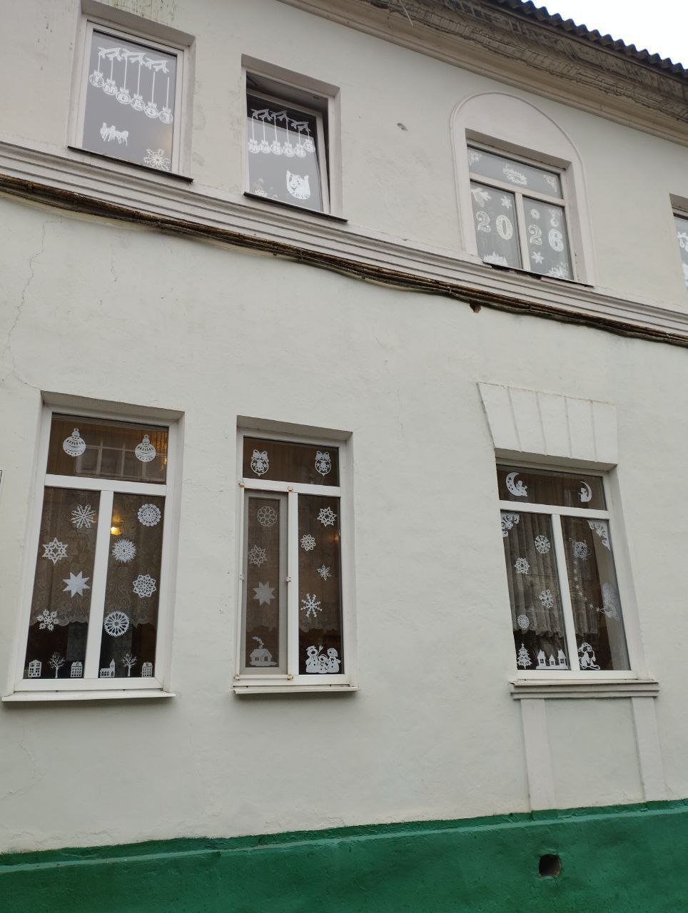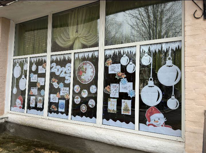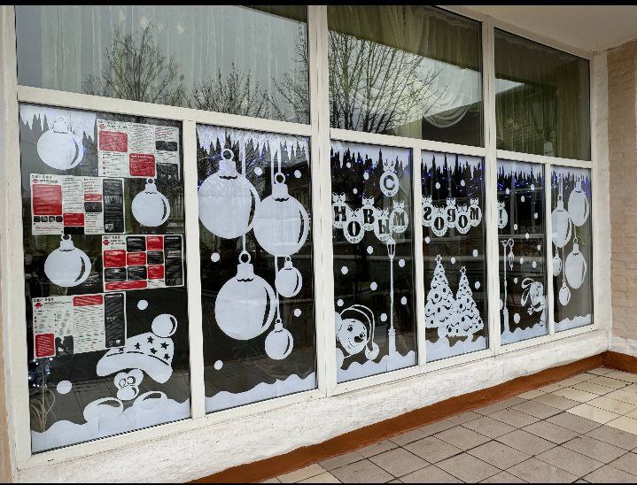 Учреждения украсили окна интересными трафаретами, создавая почти целые картины, применяя всевозможные материалы. Каждое оформление отличается оригинальностью и креативностью, что придаёт особый уют окружающей обстановке. Витрины и фасады зданий сверкают огнями, а зимние композиции вызывают чувство радости и ожидания праздника.