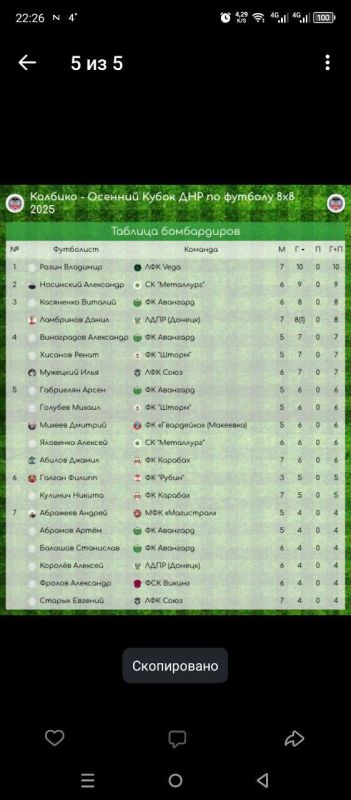 Так же Футбольным союзом ДНР ведется послематчевая статистика, в данном случае, забитых мячей. И Вот здесь изначально произошел казус. После окончания турнира были вручены награды и лучшему бомбардиру в том числе, но изначально не мне, а человеку на второй строчке в гонке бомбардиров. По технической ошибке оказалось, что 9 больше 10! Объясняю - у меня за весь турнир 10 забитых мячей(1 место в таблице) , 2 место - 9 мячей. Но со статистикой не поспоришь - награда все таки дошла до меня, пусть и спустя время и уже совсем не с теми эмоциями( фото таблицы и видео награждения прикрепляю). Спасибо команде за помощь в этом достижении!