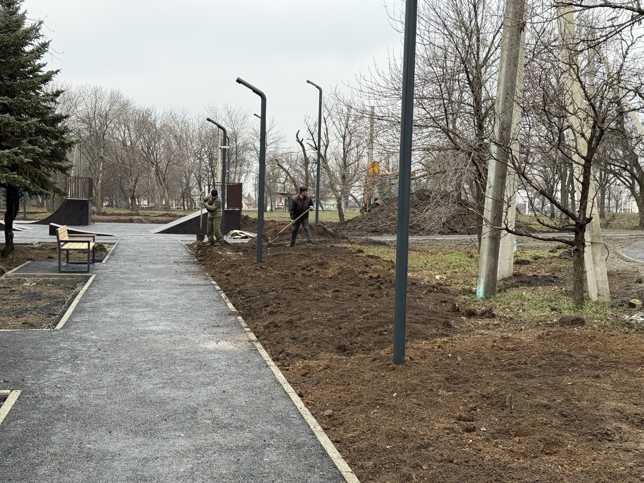 Специалисты уже завершили установку новых фонарей и укладку тротуарной плитки, а также приступили к монтажу скамеек.