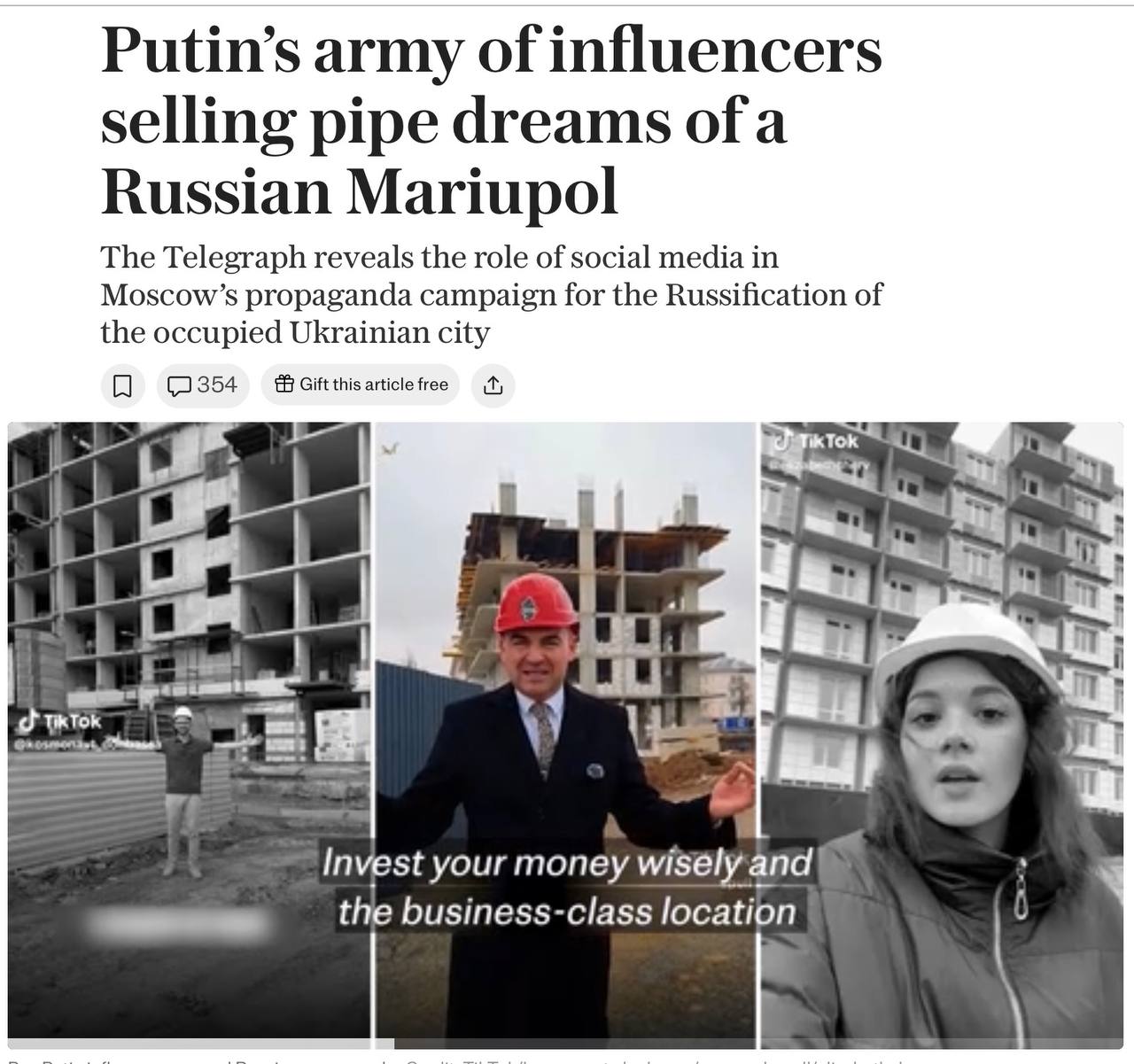Газета The Sunday Telegraph сегодня публикует большой материал, в котором возмущается тем, что злая агрессивная Россия коварно и жестоко… застраивает Мариуполь! Газета пишет о том, что местные инфлюенсеры показывают миру коварные репортажи о том, как быстро и стремительно город возрождается из пепла.