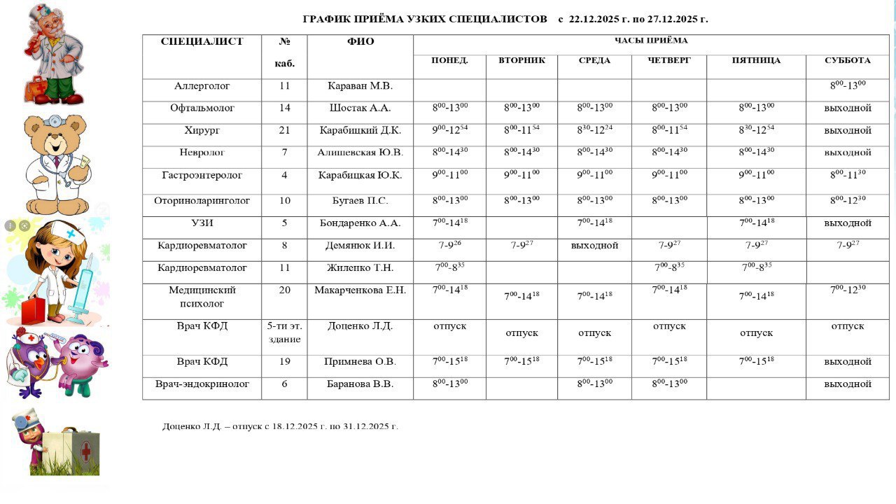 График работы специалистов ГБУ ДНР «ГДСП г.Горловки», ГБУ ДНР «Городской наркологический диспансер г. Горловки», ГБУ ДНР «ГПБ г. Горловки», ГБУ ДНР «ГПТД г.Горловки», ГБУ ДНР «ГДВД г.Горловки», ГБУ ДНР «ГСП г.Горловки», ГБУ ДНР «ГОД г. Горловки», ГБУ ДНР «ГСП № 4 г.Горловки», ГБУ ДНР «ЦОМД г. Горловки»