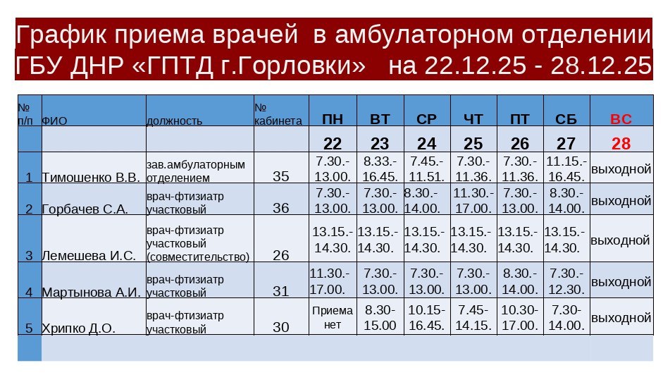 Иван Приходько: График работы специалистов ГБУ ДНР «ГДСП г.Горловки», ГБУ ДНР «Городской наркологический диспансер г. Горловки», ГБУ ДНР «ГПБ г. Горловки», ГБУ ДНР «ГПТД г.Горловки», ГБУ ДНР «ГДВД г.Горловки», ГБУ ДНР «ГСП...