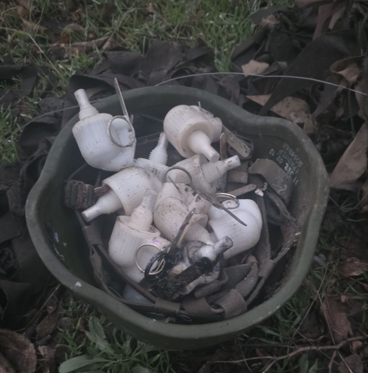 На фото в трофейной каске - вражеские наступательные гранаты. Еще не охолощенные.