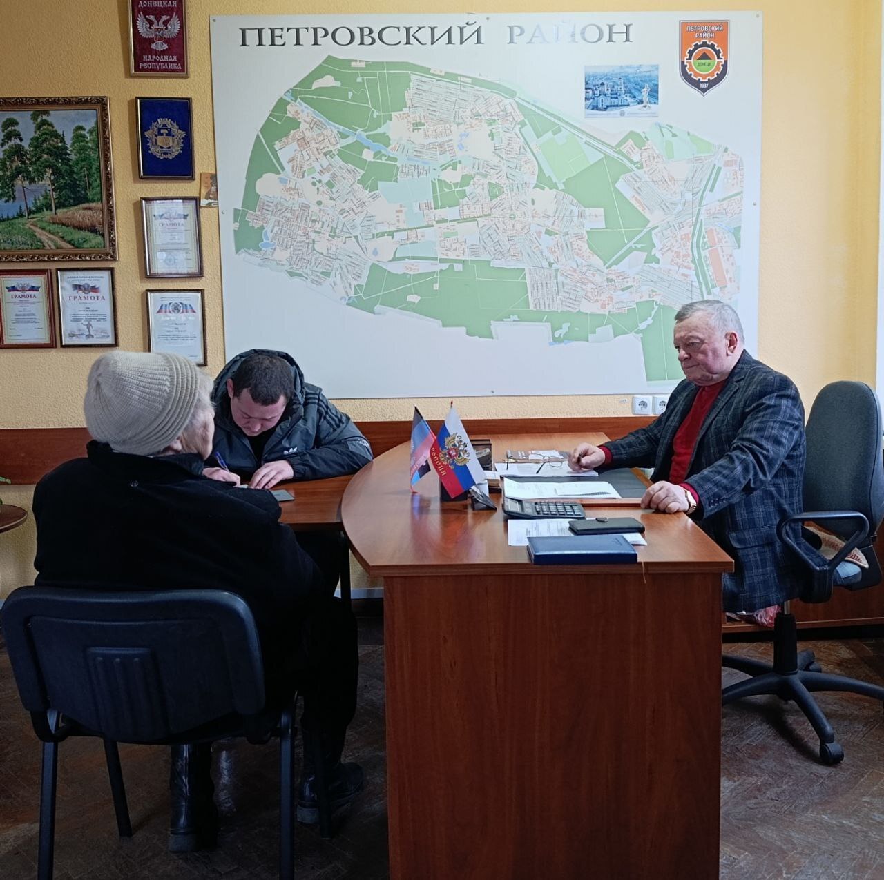 Сегодня, 23 декабря, заместитель руководителя Управы Петровского внутригородского района Администрации городского округа Донецк Сергей Васильевич Чуб провёл еженедельный приём жителей района. В ходе приёма, жители обратились по вопросам жилищно-коммунального характера и разрушения жилья.