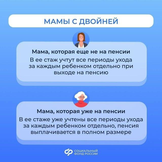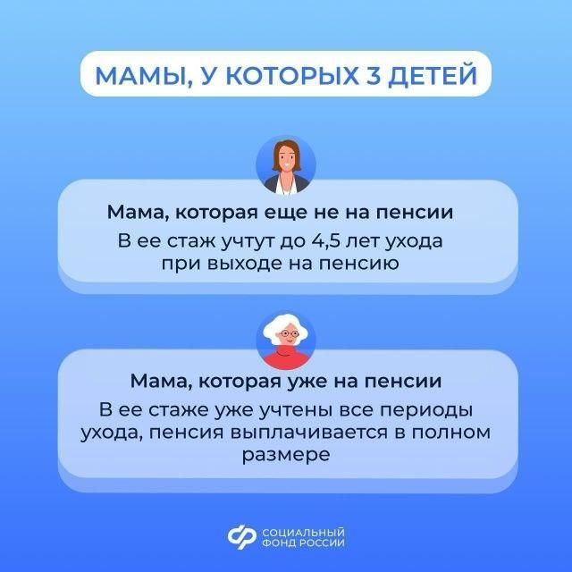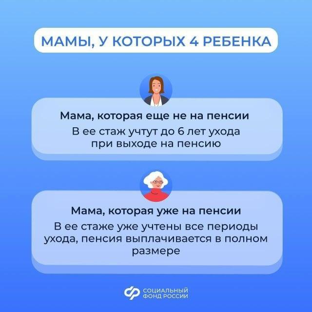 Напоминаем, что для выхода на страховую пенсию необходимо иметь 15 лет стажа и индивидуальный пенсионный коэффициент в размере 30. Также для многодетных мам предусмотрен досрочный выход на пенсию.