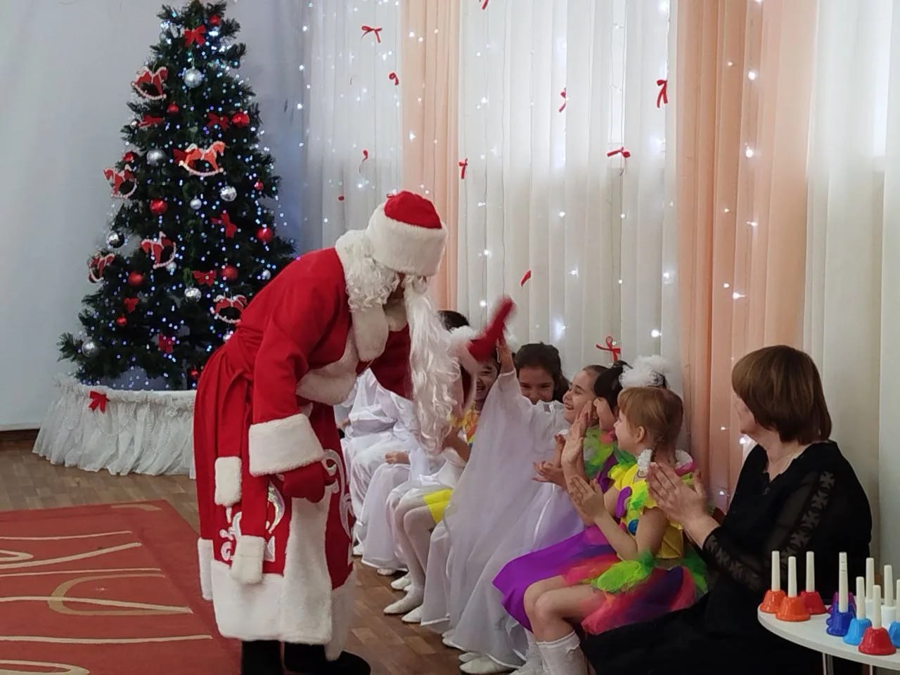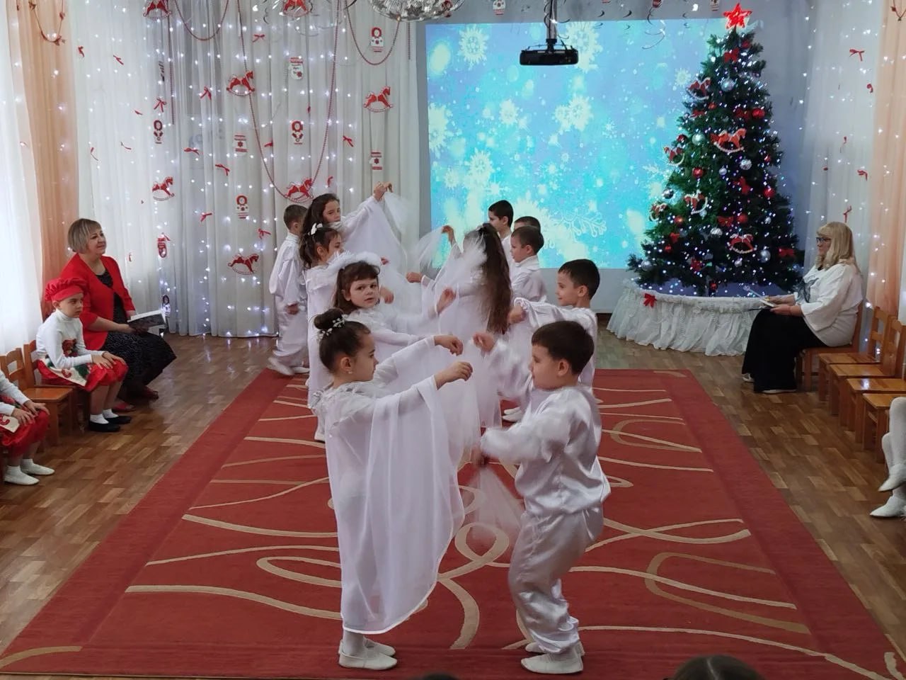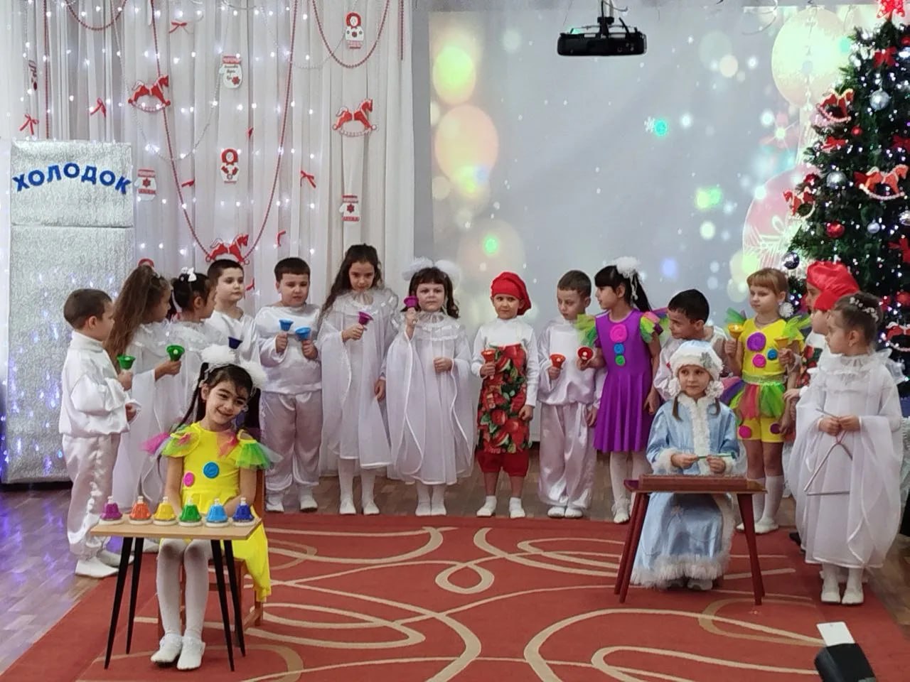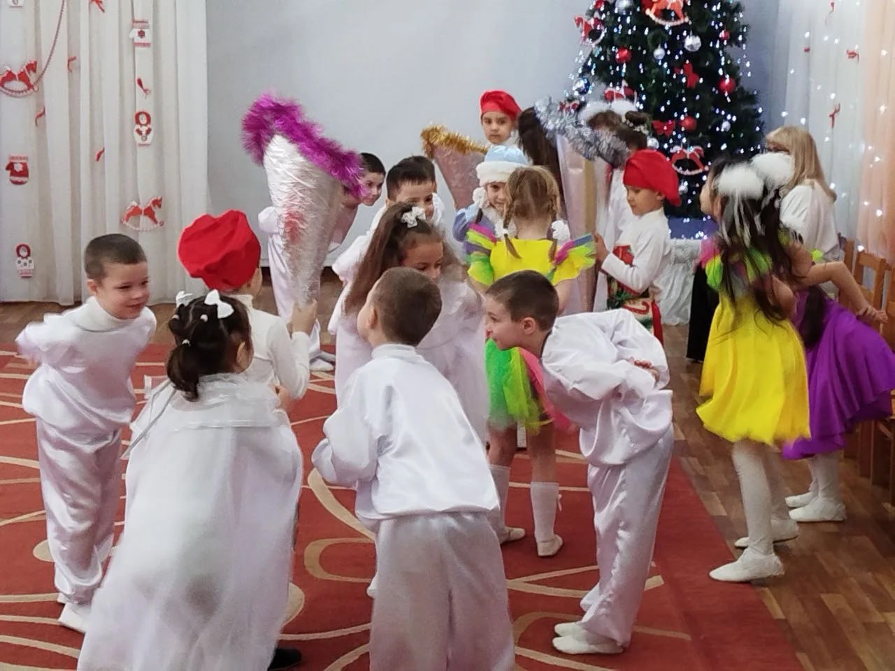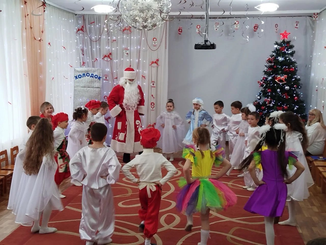 Сказочно украшенный музыкальный зал, сверкающие огоньки, нарядная ёлка, увлекательные танцы и хороводы, весёлые игры подарили ребятам и их родителям праздничное новогоднее настроение.