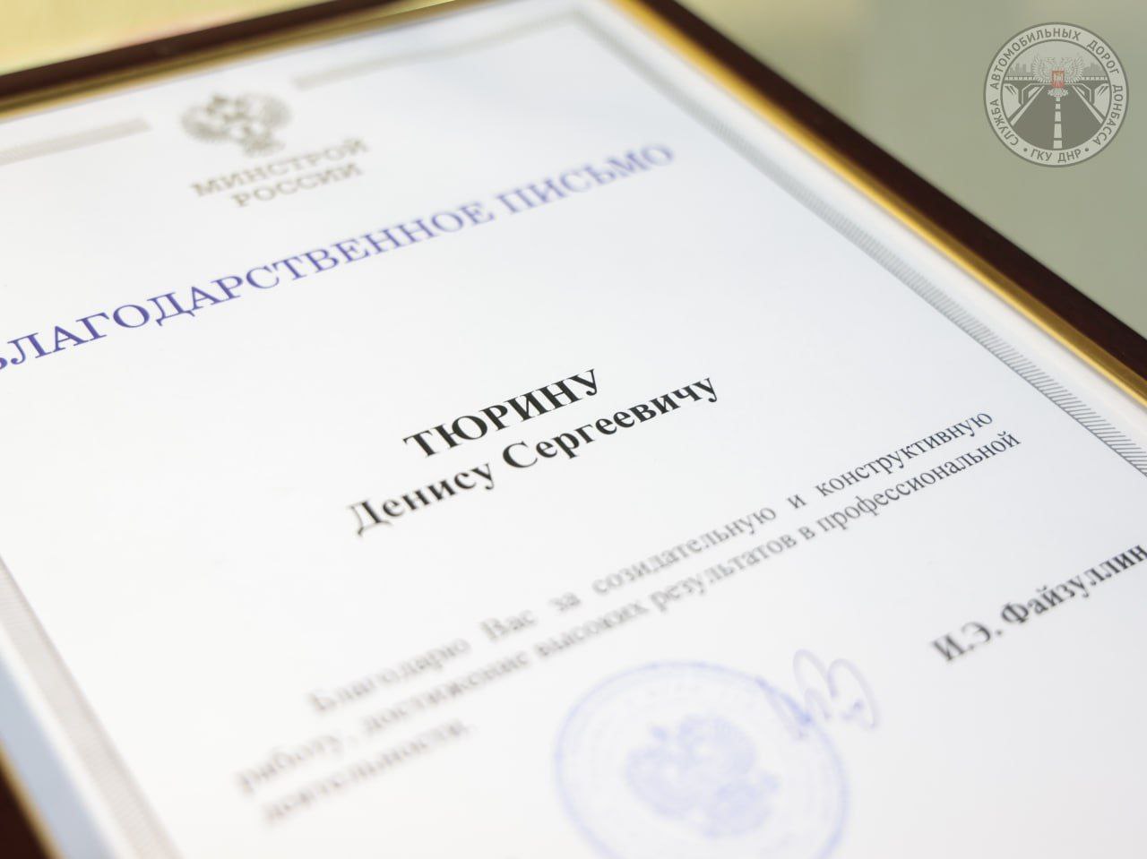 Сегодня в ходе аппаратного совещания в Минтрансе ДНР министр транспорта Александр Бондаренко передал директору ГКУ ДНР "Служба автомобильных дорог Донбасса" Денису Тюрину Благодарственное письмо Минстроя России, подписанное Иреком Файзуллиным.