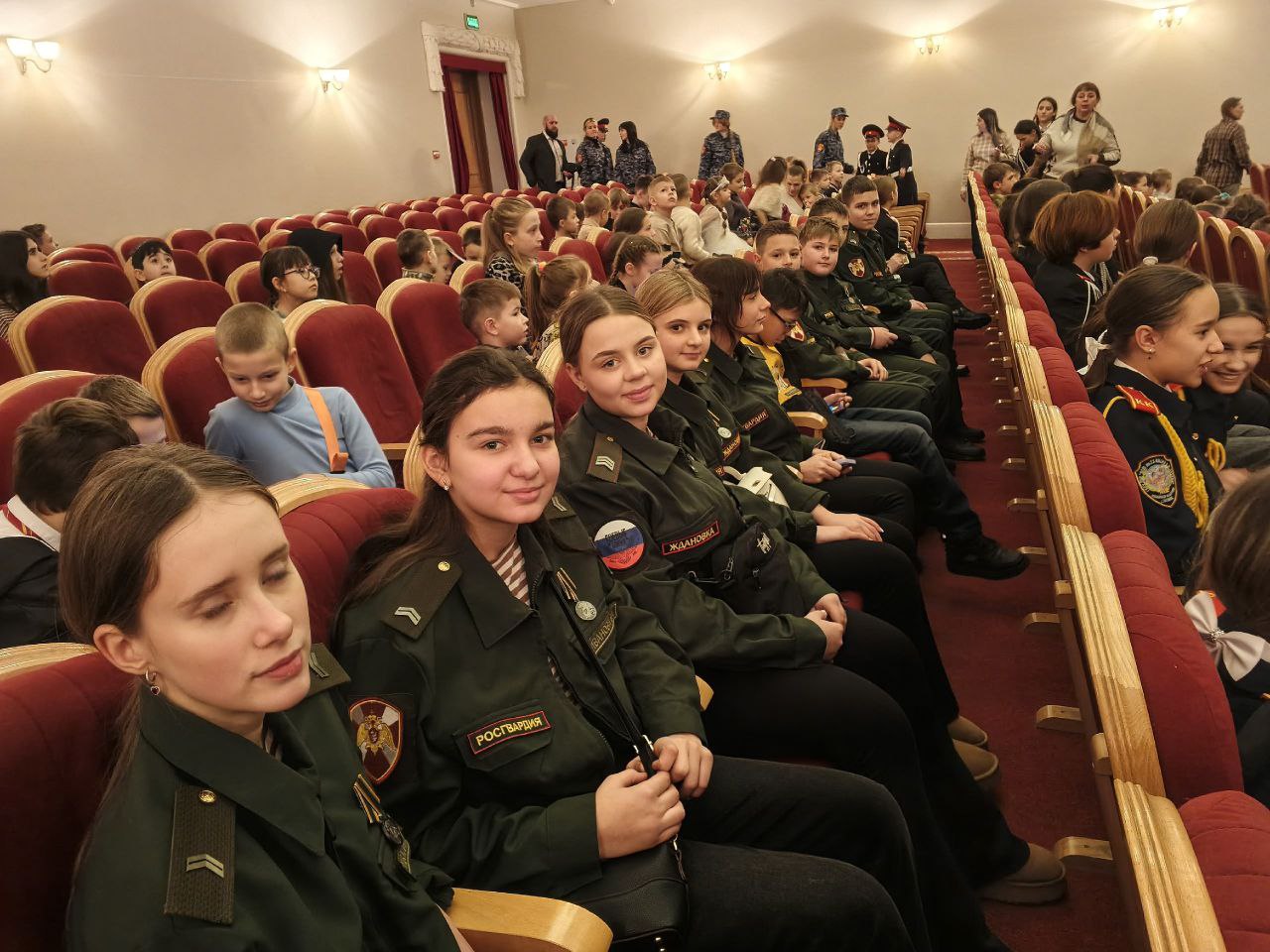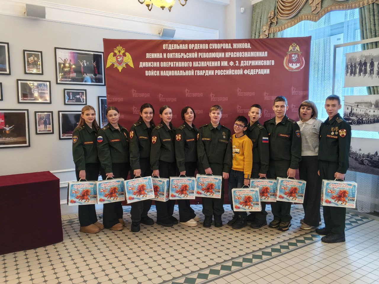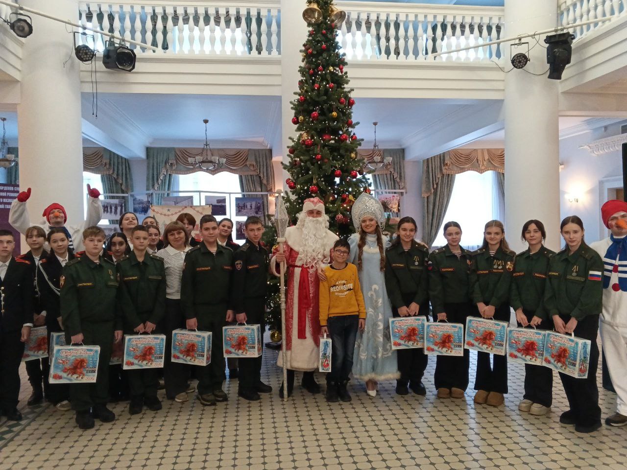 После ребята посмотрели тематический концерт ансамбля песни и пляски ОДОН войск национальной гвардии. Гвардейцы получили новогодние подарки от благотворительного фонда «Победоносец».