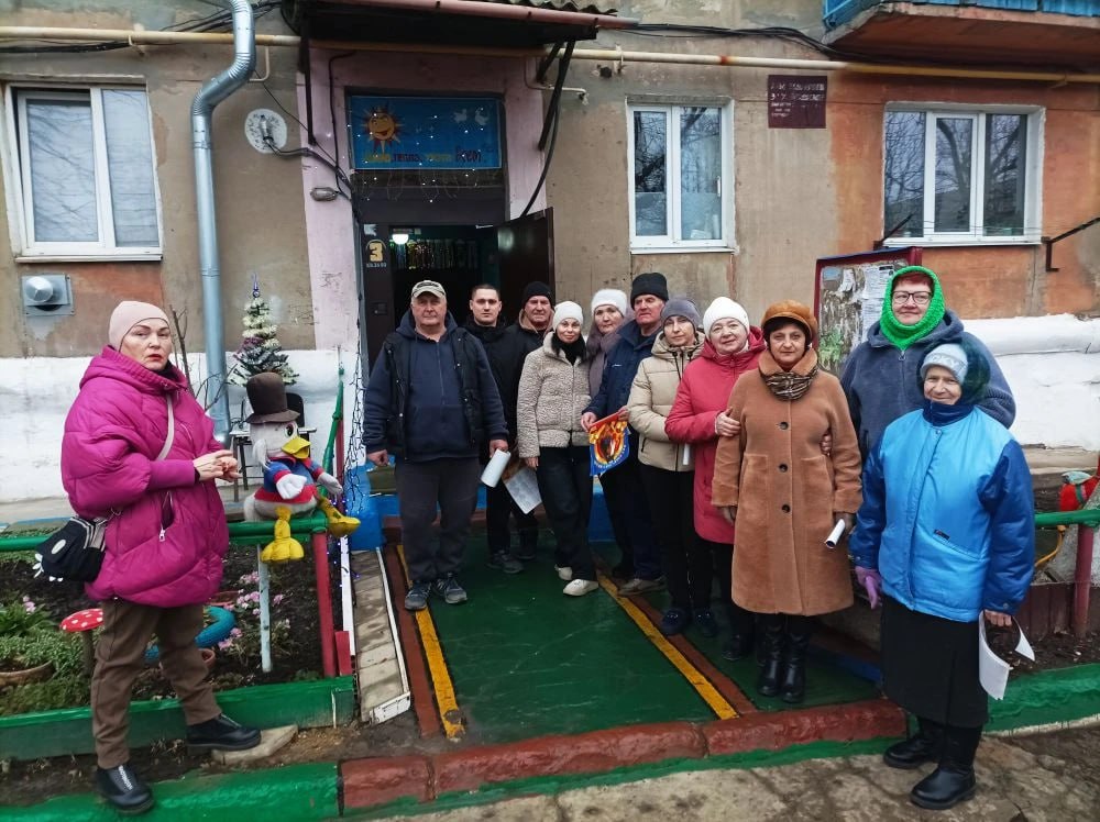 Участники ТОС «Комсомолец» дружно вышли, чтобы украсить территорию яркими гирляндами, игрушками и нарядной елкой.