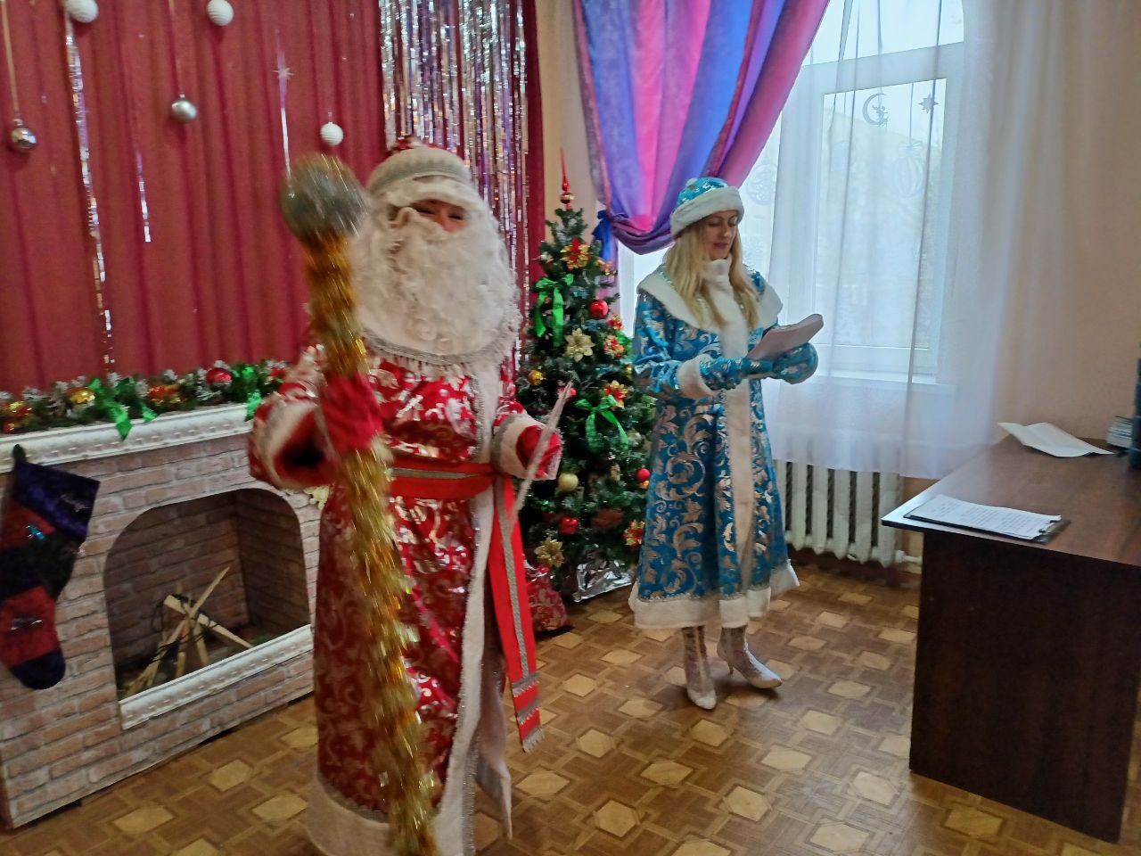 Всех присутствующих пришли поздравить с Новым годом Дед Мороз и Снегурочка. Каждый желающий смог окунуться в детство. Все старались внести в атмосферу праздника новогоднее настроение и дарили друг другу поздравления. Каждый из присутствующих получил новогодний сладкий подарок от Деда Мороза.