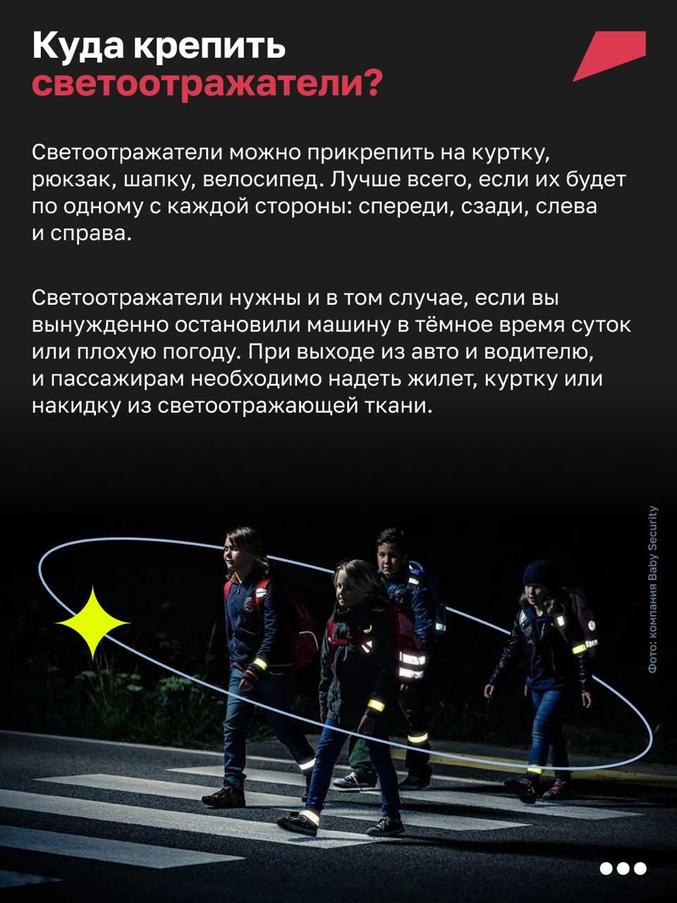 Будь ярким — будь в безопасности. Используй светоотражающие элементы при выборе одежды.