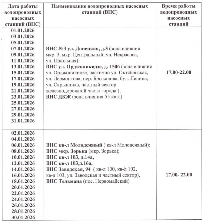 График подачи воды на город Ясиноватая в период с 01.01.2026 по 31.01.2026