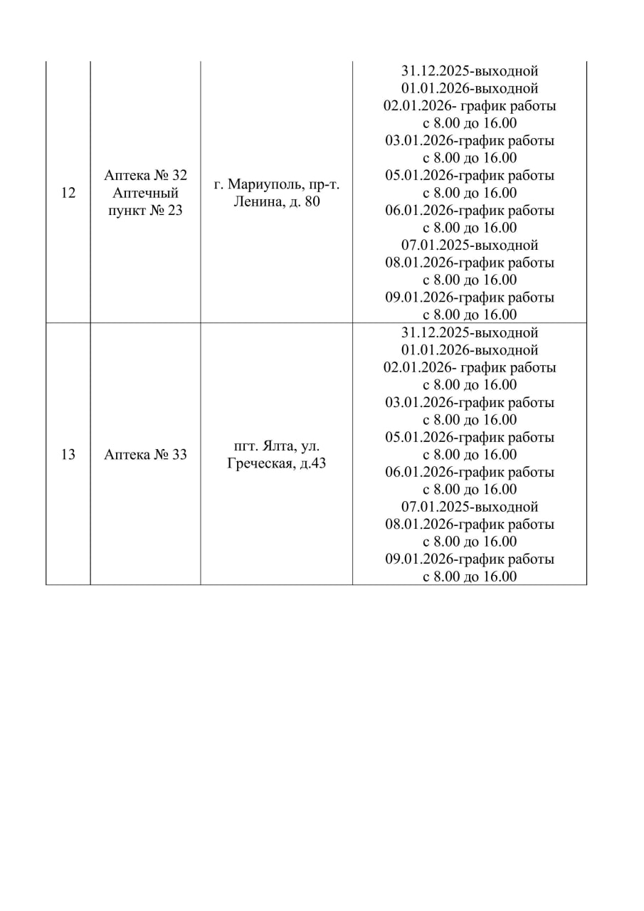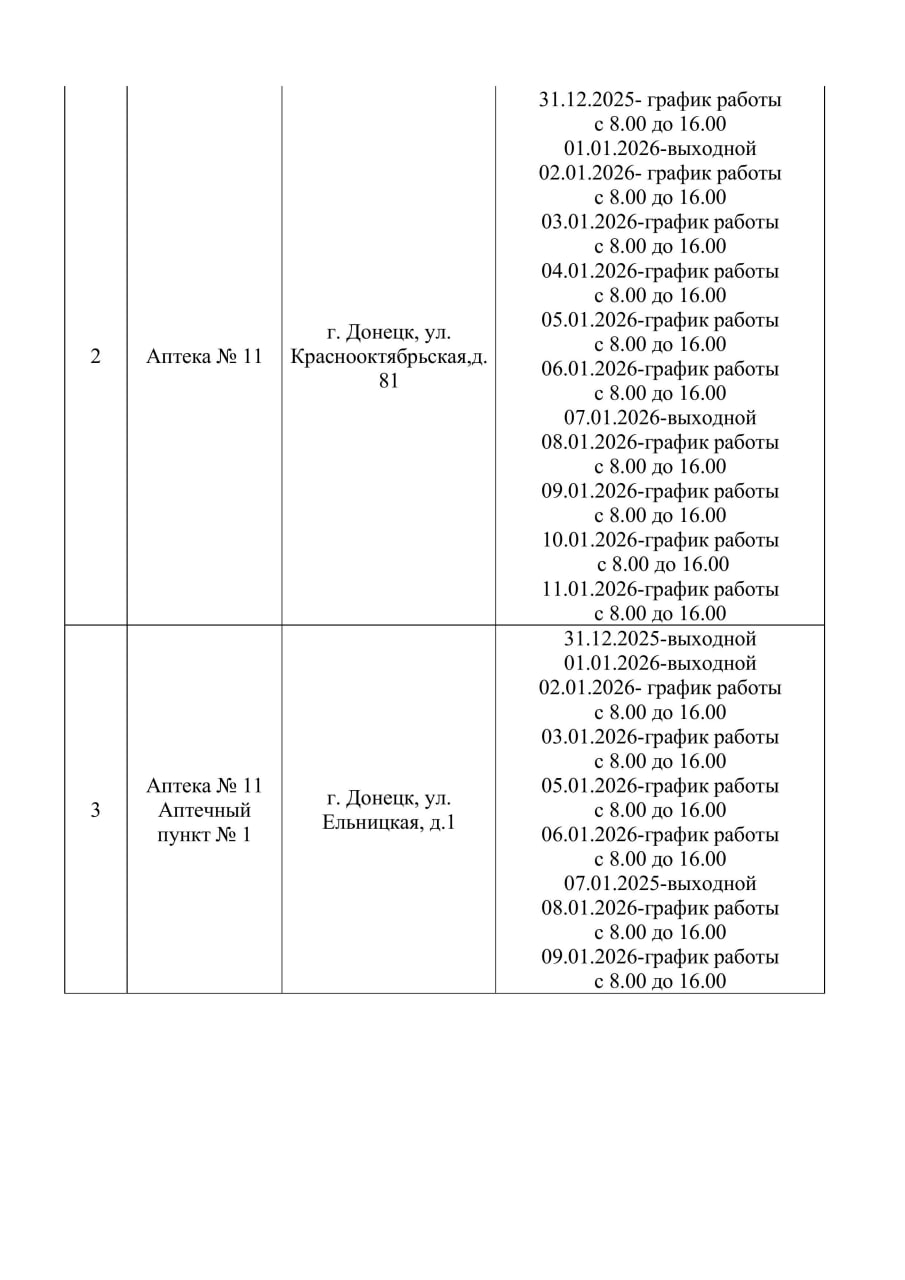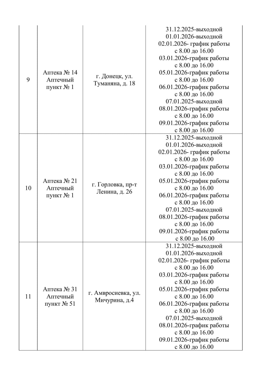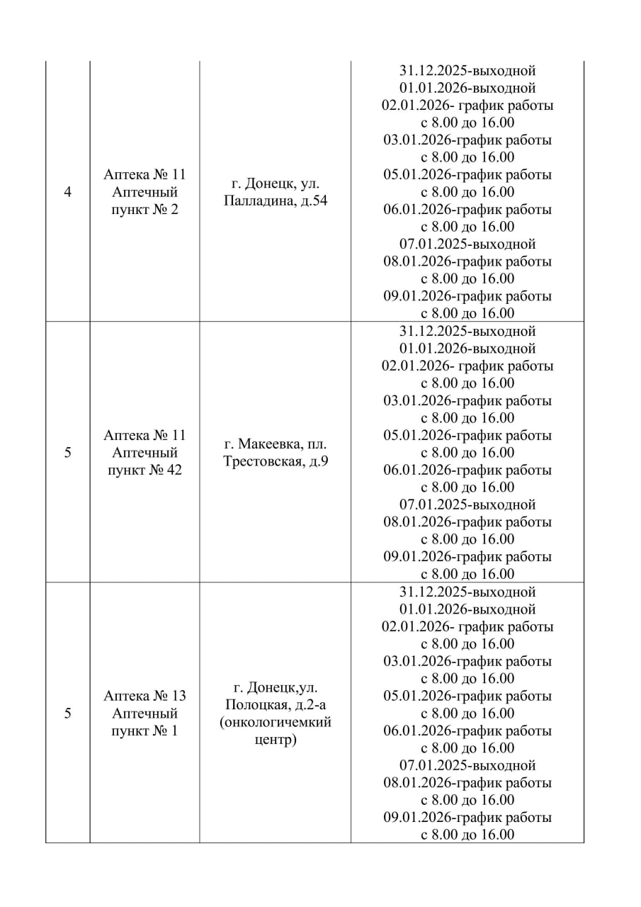 График работы дежурных аптек и аптечных пунктов Республиканского центра «Торговый Дом «Лекарства Донбасса» в новогодние праздничные дни – с 31 декабря 2025 года по 11 января 2026 года@PRO_respubliku