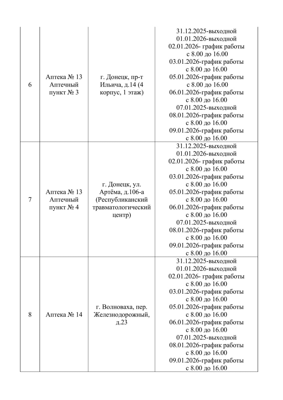 График работы дежурных аптек и аптечных пунктов Республиканского центра «Торговый Дом «Лекарства Донбасса» в новогодние праздничные дни – с 31 декабря 2025 года по 11 января 2026 года