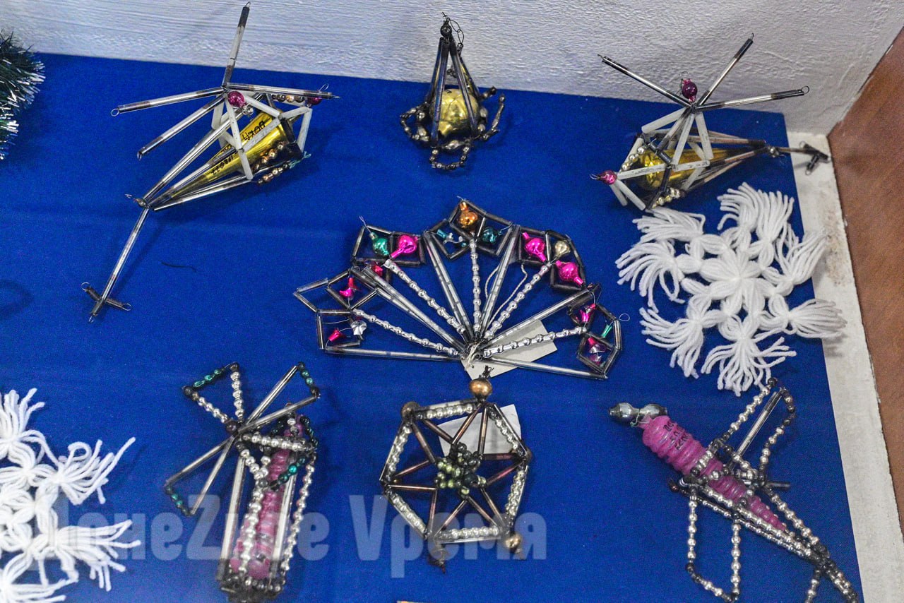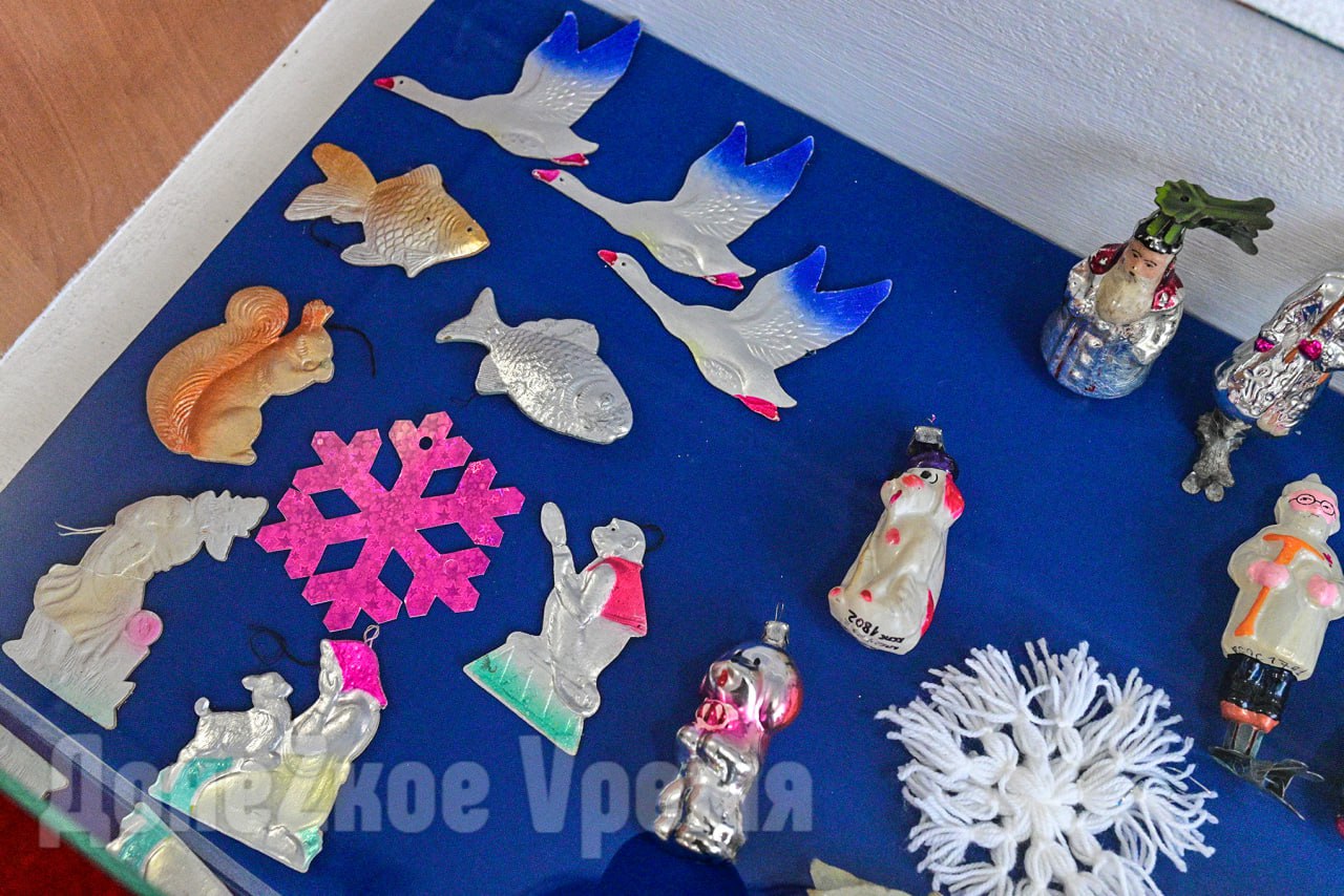 Выставка ведет посетителей через эпохи. Вот простейшие украшения времен Великой Отечественной — разукрашенные перегоревшие лампочки, из которых бойцы также делали свечи. Вот елочные игрушки 1930-х из картона и ваты — дешевые, простые, но очень долговечные.