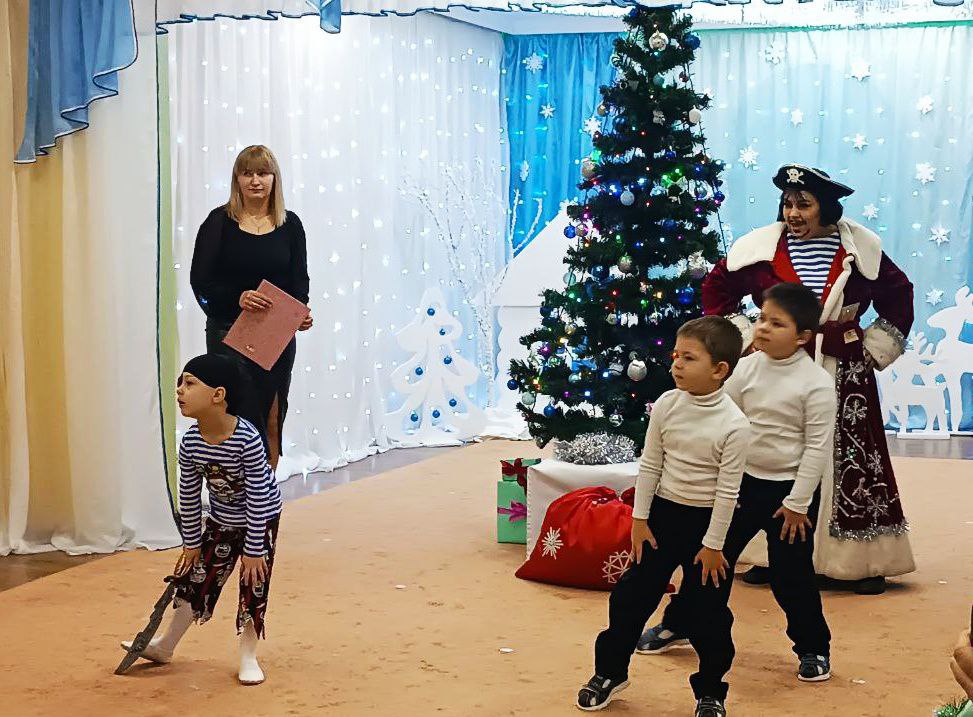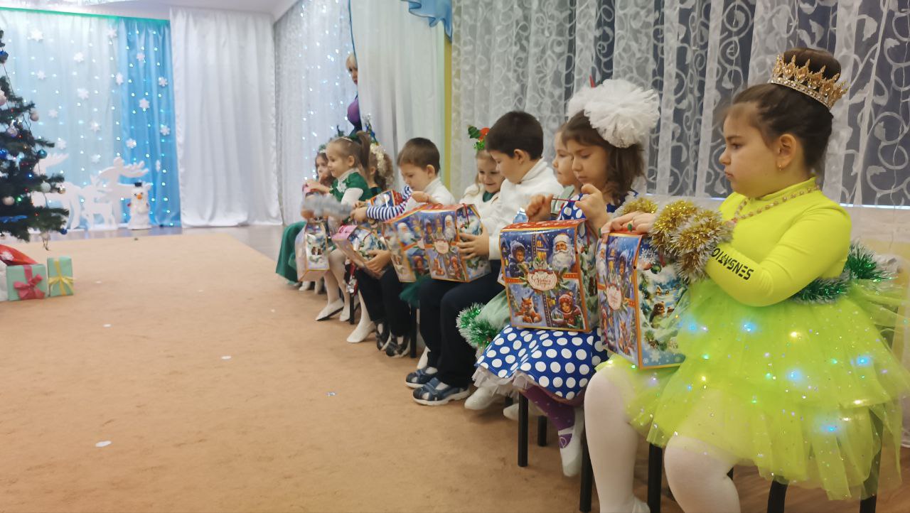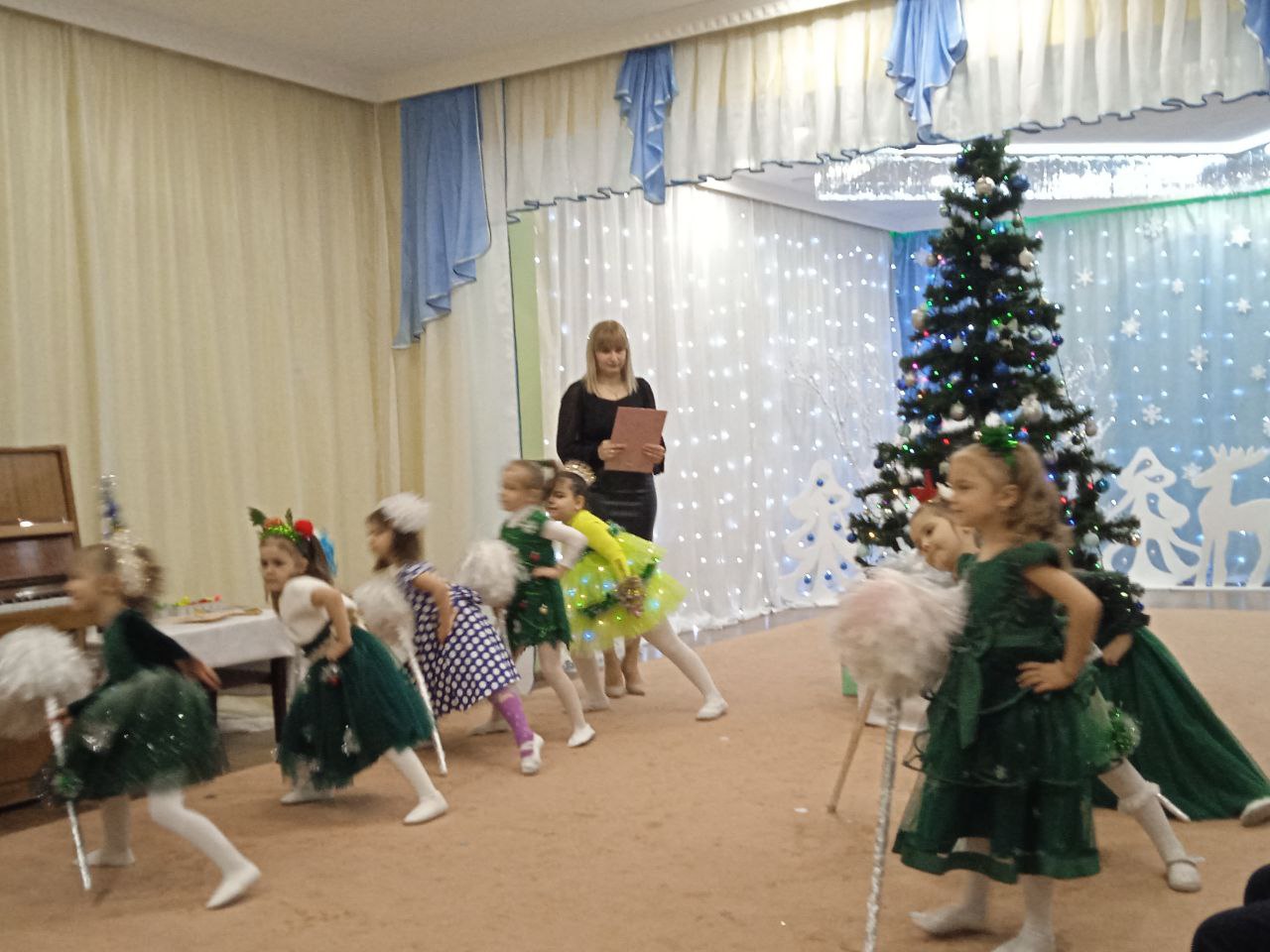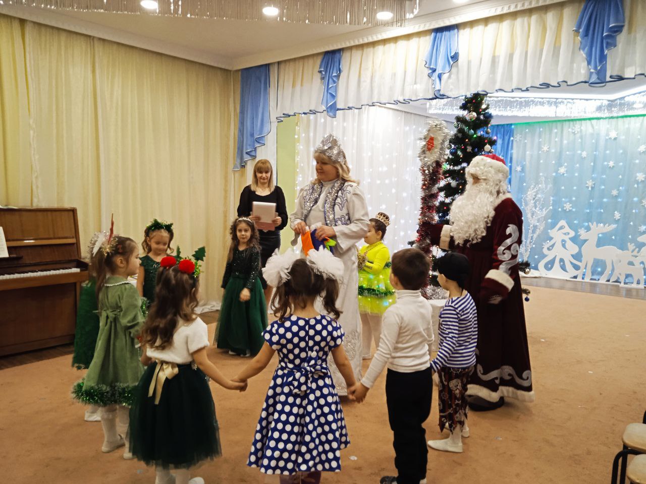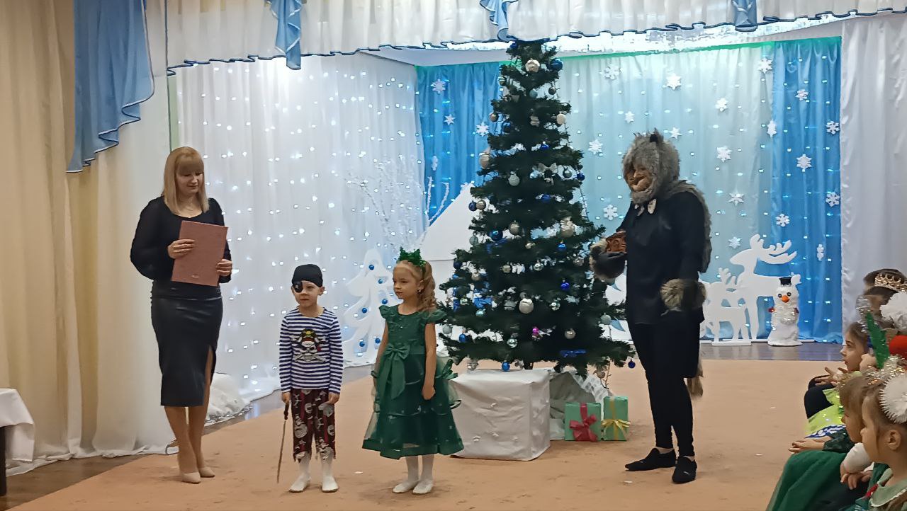 Главной героиней торжества стала нарядная ёлочка, сияющая разноцветными огоньками и украшенная сверкающими игрушками. Её красоту дополнили девочки в костюмах лесных красавиц. Ну и какой же Новый год без любимых сказочных героев? На празднике появились Учёный кот, злой Бармалей и озорная Баба Яга. Ребята отправились в волшебный мир сказок, стали участниками захватывающих приключений. С восторгом дети наблюдали, как Дедушка Мороз и его внучка Снегурочка вручили им долгожданные подарки.