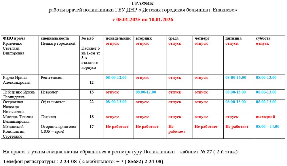 График приёма врачей поликлиники детской городской больницы города Енакиево.