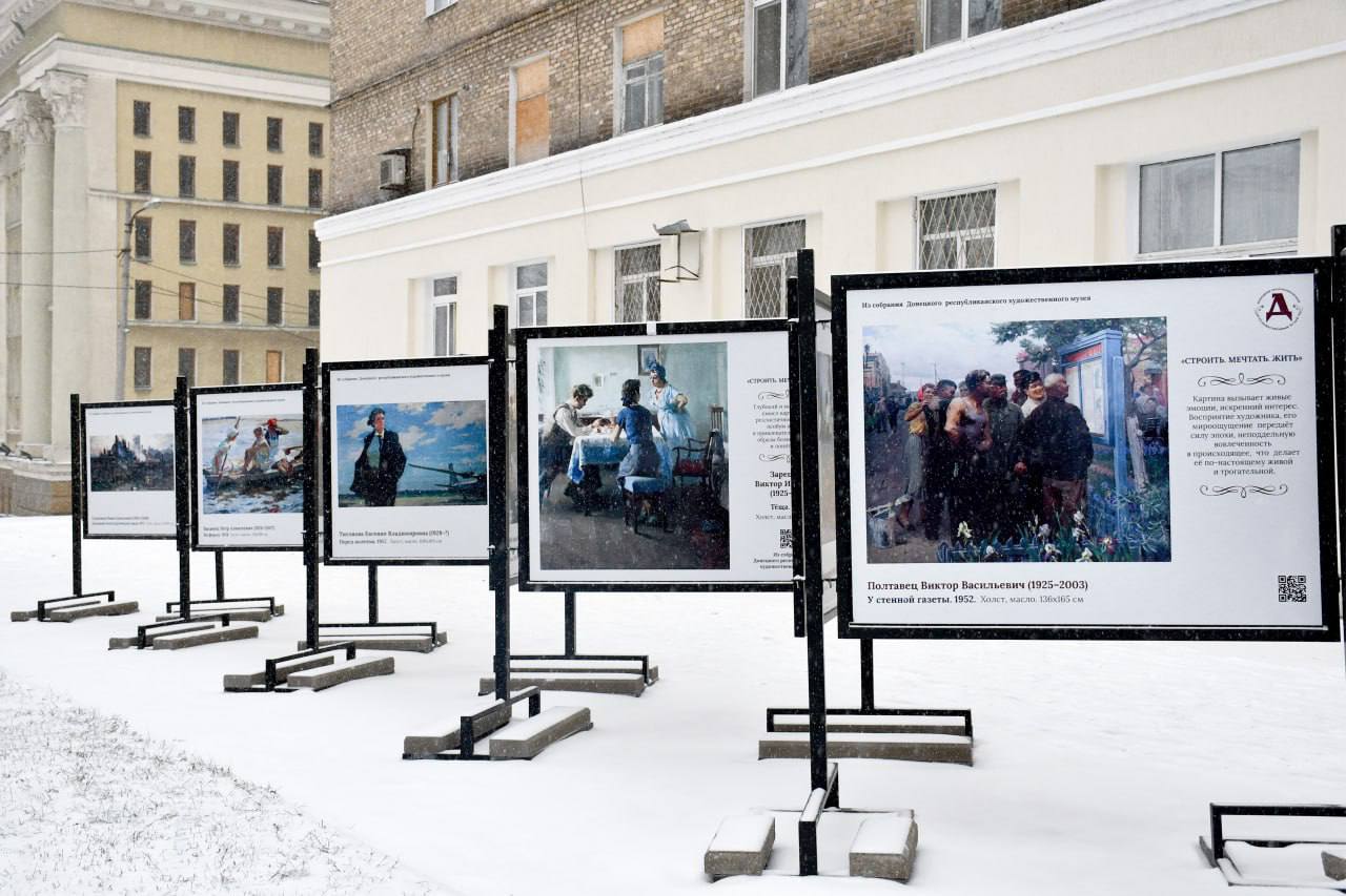 Выставка называется «Строить. Мечтать. Жить». Она состоит из больших стендов с картинами, которые обычно хранятся в фондах музея. На стендах можно увидеть картины в стиле соцреализма. Работы рассказывают о жизни людей в прошлом веке: об их труде, радостях и больших мечтах. Каждое полотно показывает, как строилась страна и во что верили наши деды и прадеды.