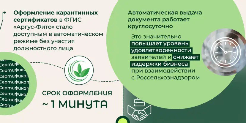 Автоматическое оформление и выдача карантинного сертификата в ФГИС «Аргус-Фито» работает в круглосуточно, в том числе в выходные и праздничные дни. Оформление карантинного сертификата, прошедшего автоматическую проверку, занимает в среднем 1 минуту.