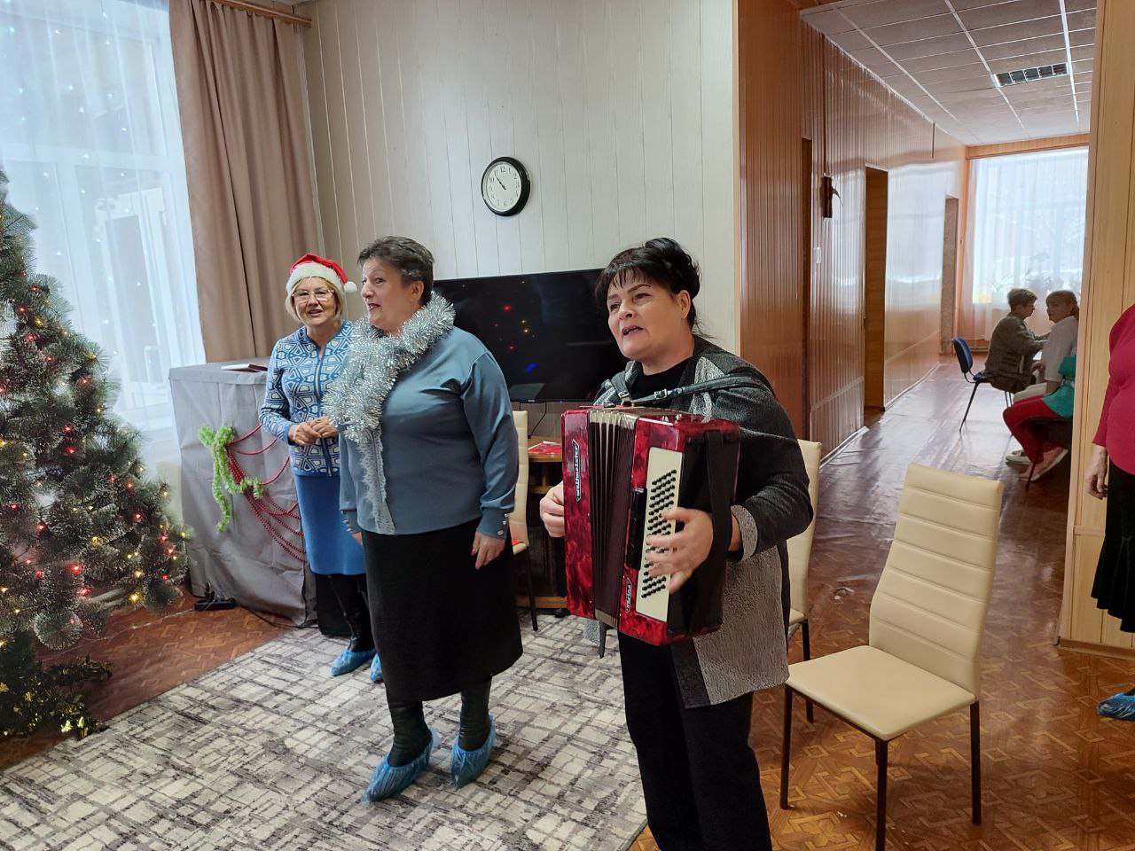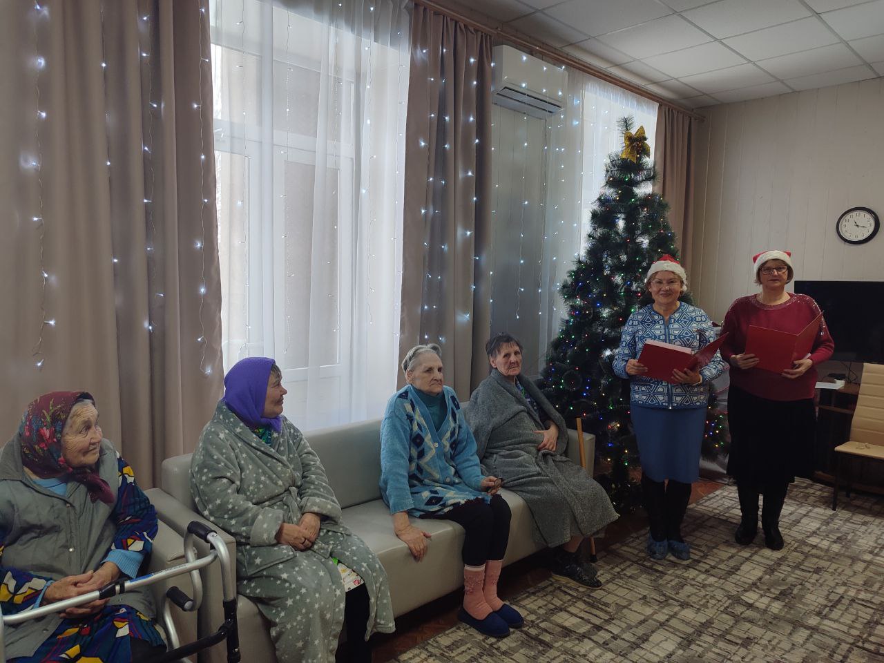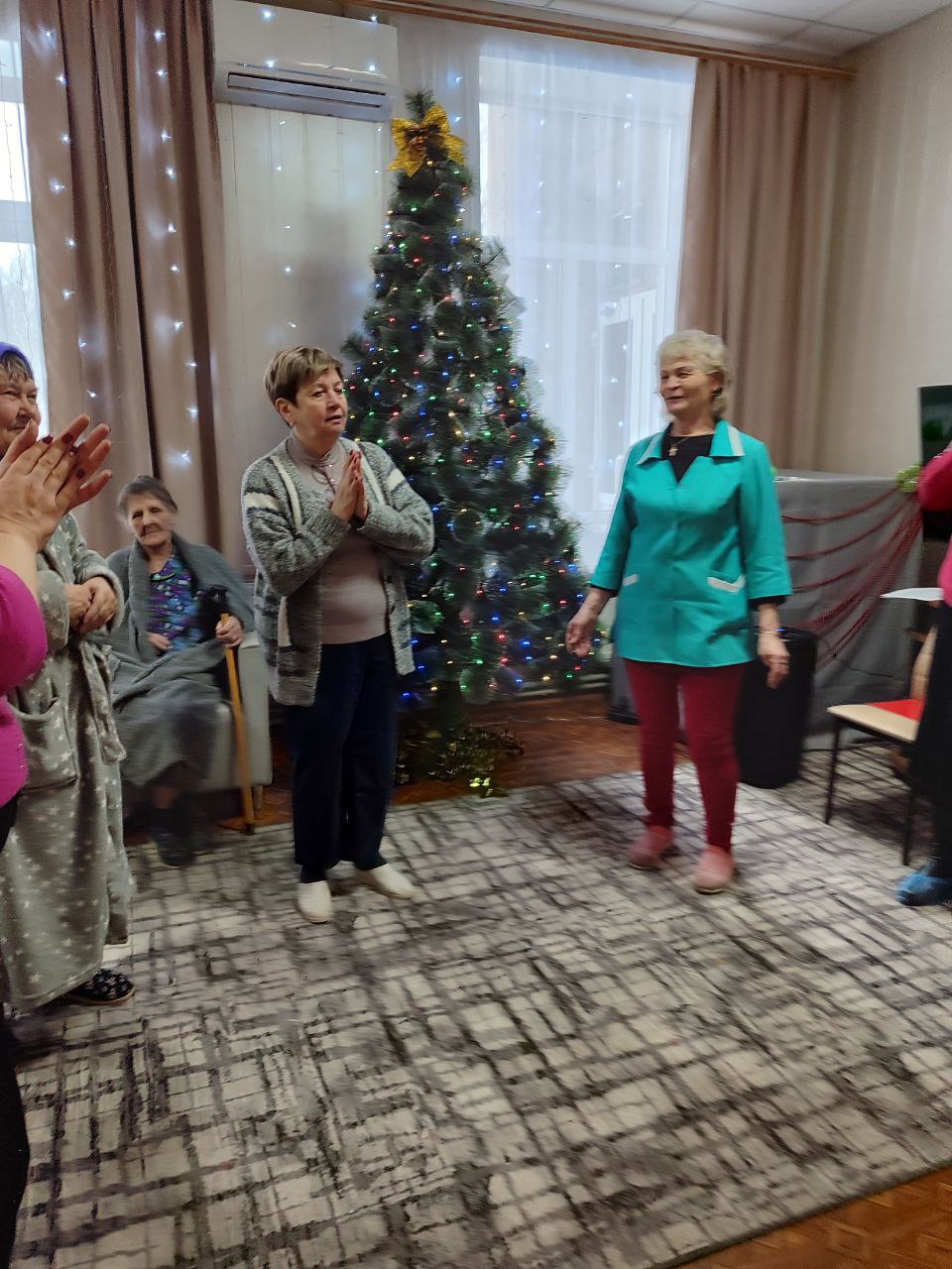 Сотрудники библиотеки-филиала №11 и Территориального центра социального обслуживания провели для временно проживающих в стационарном отделении Центра час досуга «В ритме Нового года».