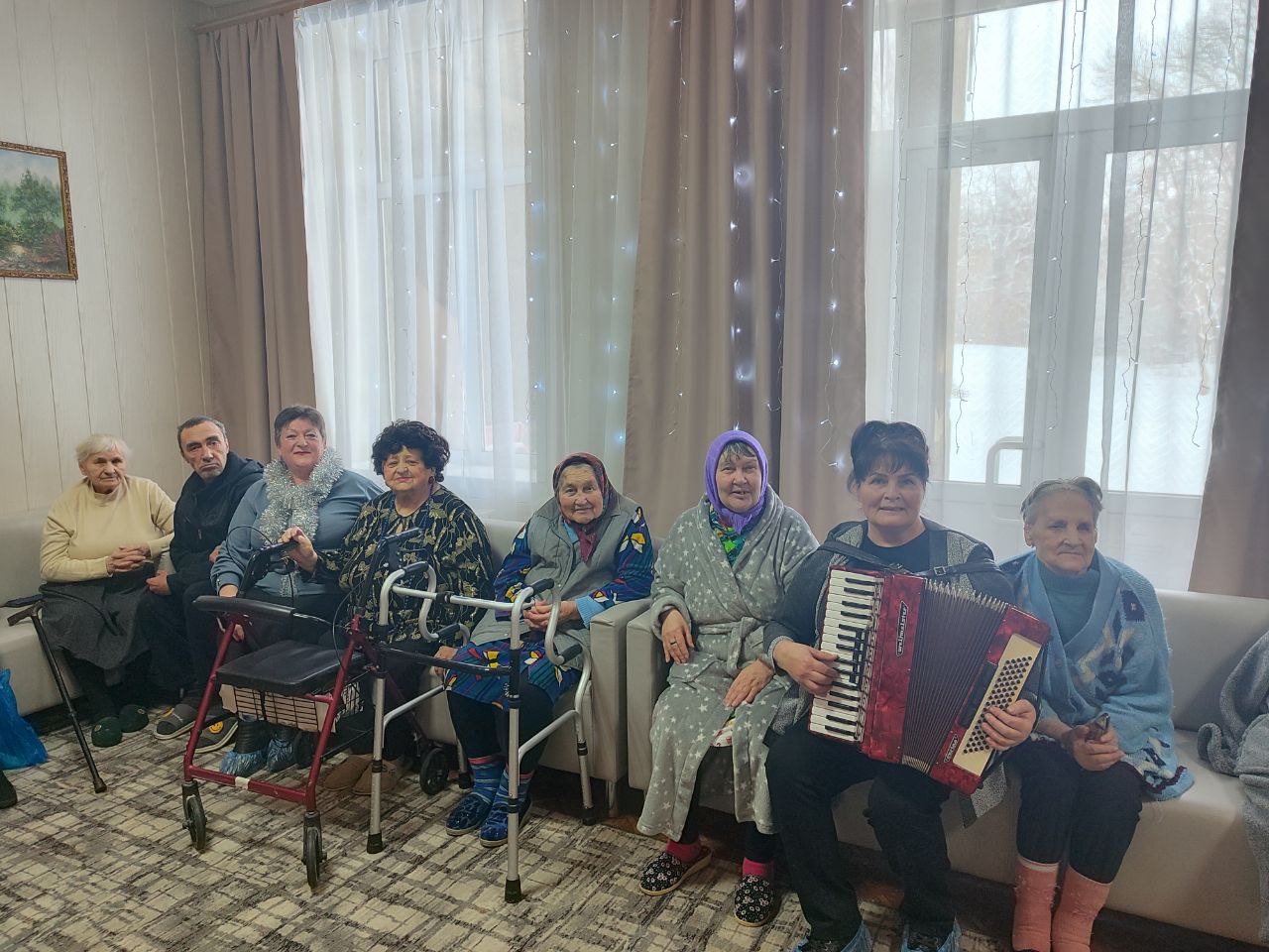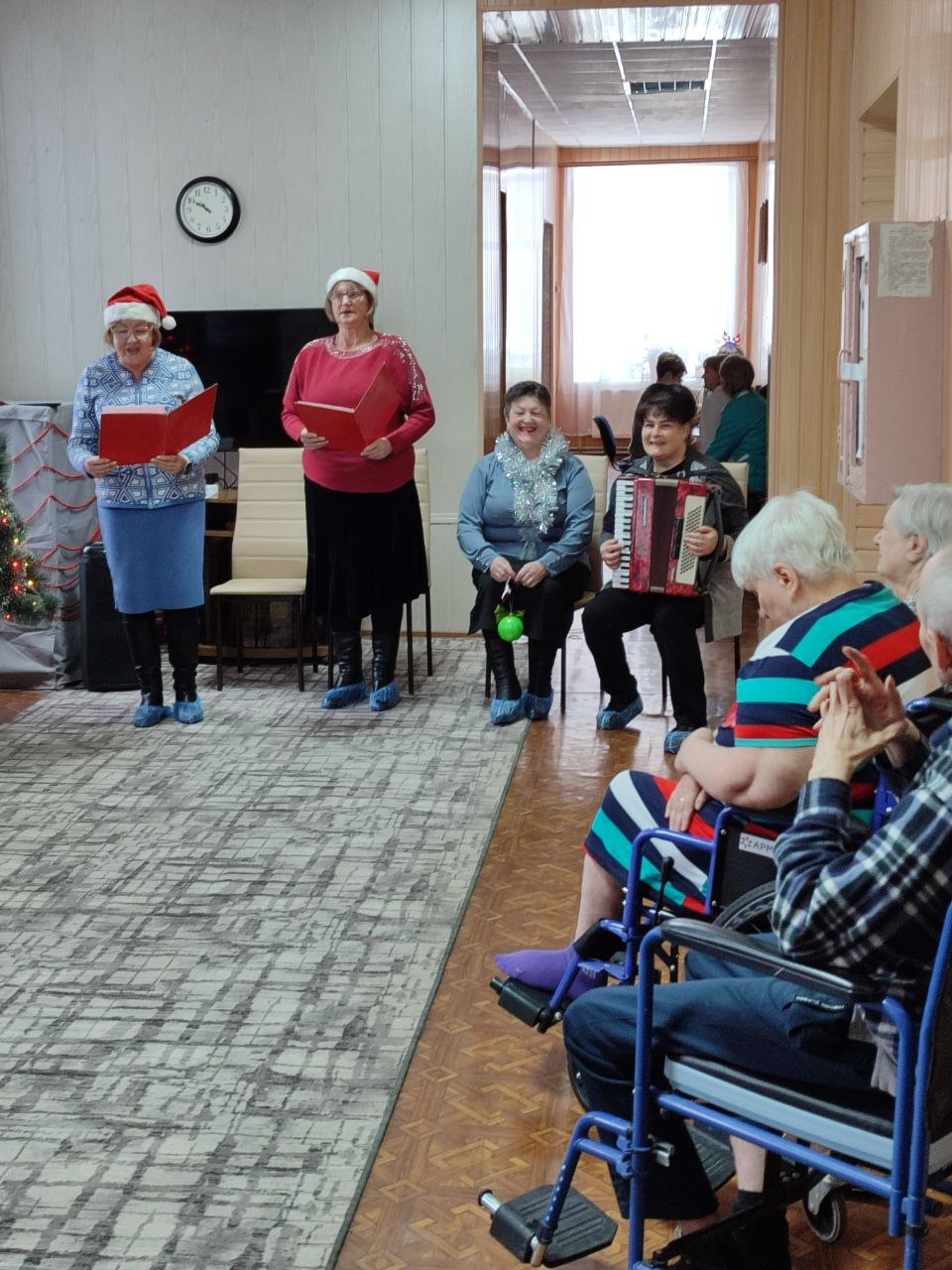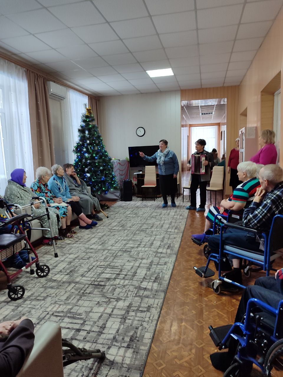 Сотрудники библиотеки-филиала №11 и Территориального центра социального обслуживания провели для временно проживающих в стационарном отделении Центра час досуга «В ритме Нового года».