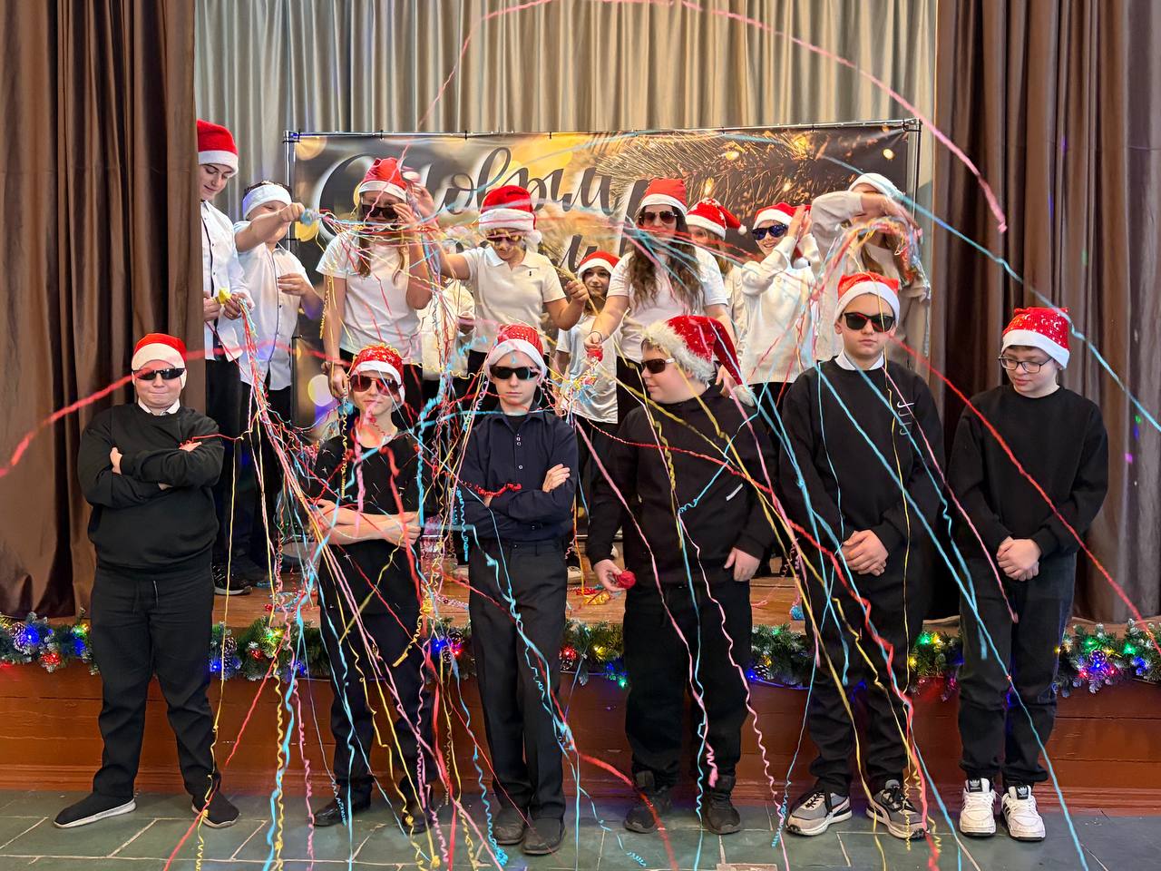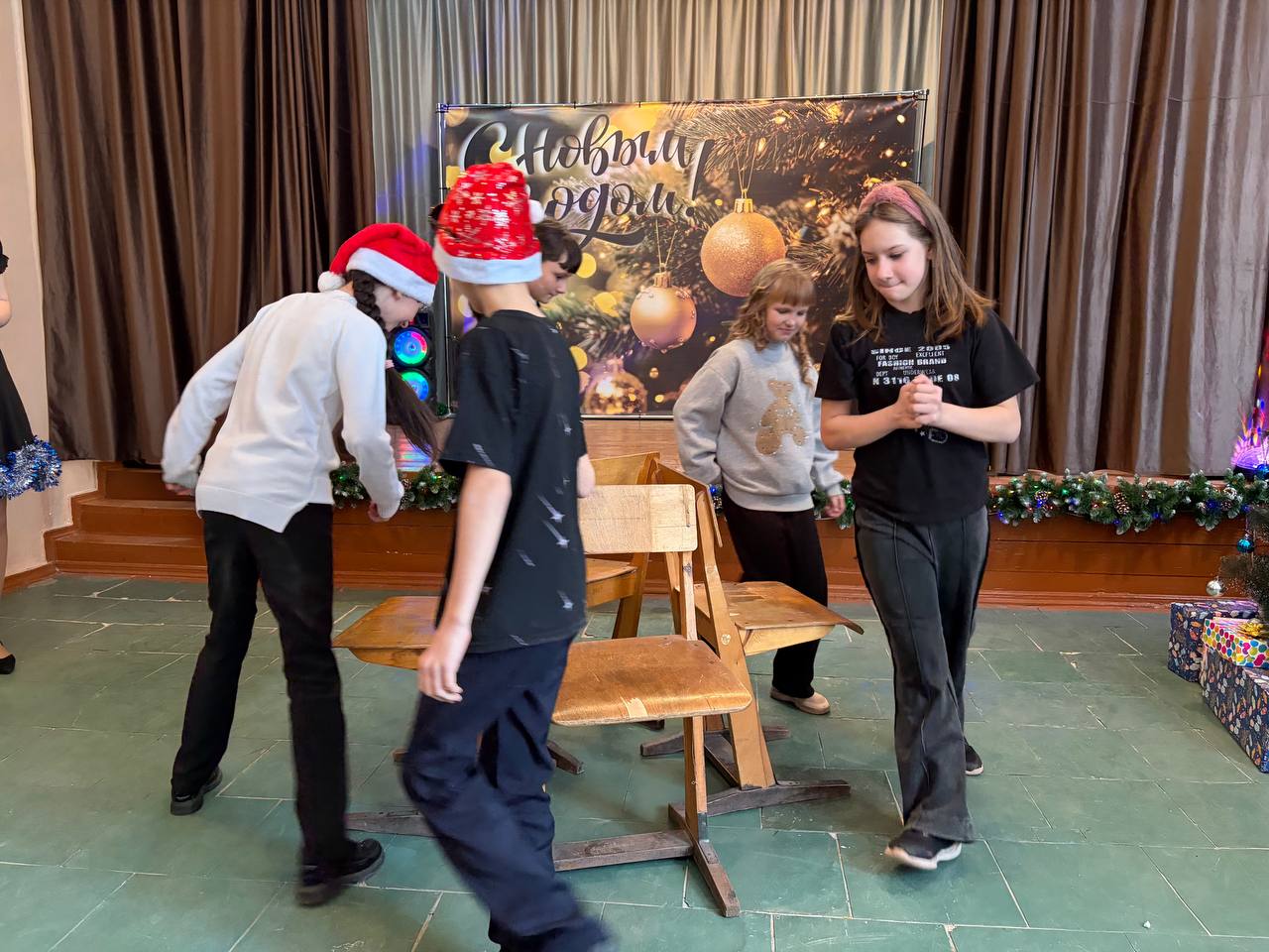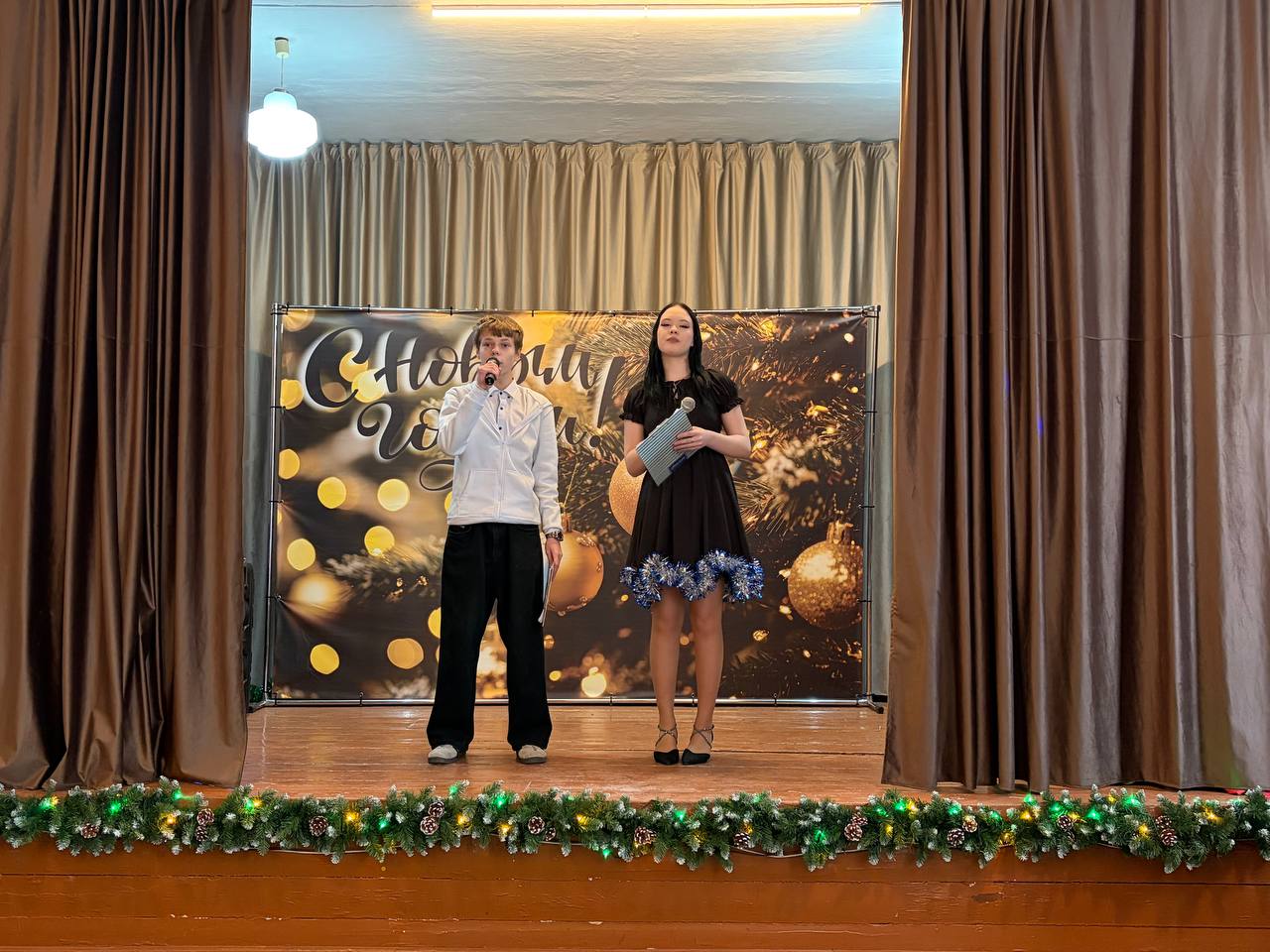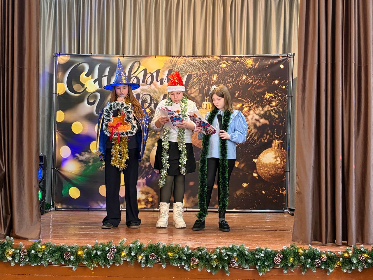 Праздничная атмосфера царила в школьном зале с первых минут. Украшенная ёлка, мерцающие гирлянды и нарядные декорации создавали настоящее новогоднее настроение.