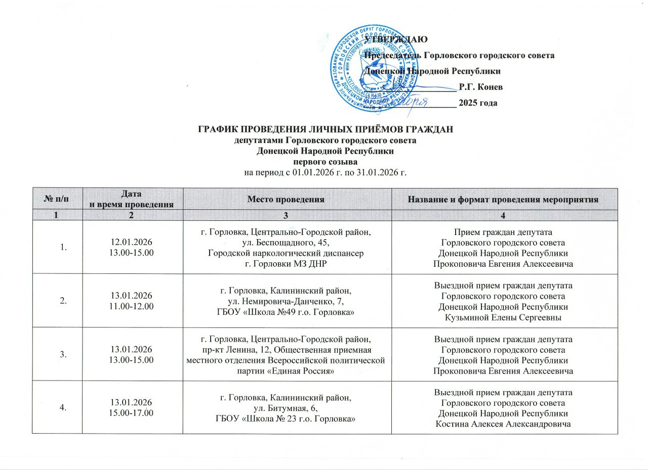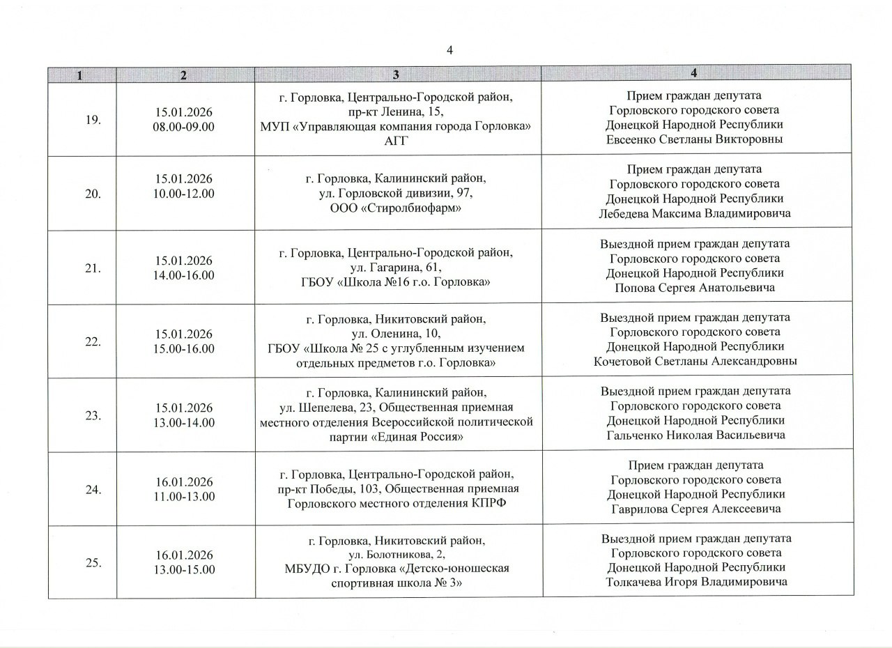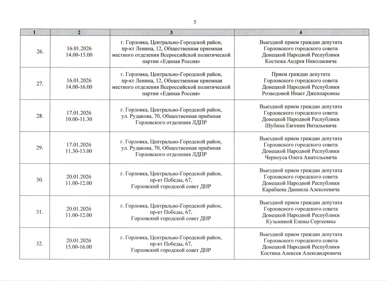 График проведения приёмов депутатами Горловского городского совета Донецкой Народной Республики первого созыва на период с 01.01.2026 г. по 31.01.2026 г. (часть 1)
