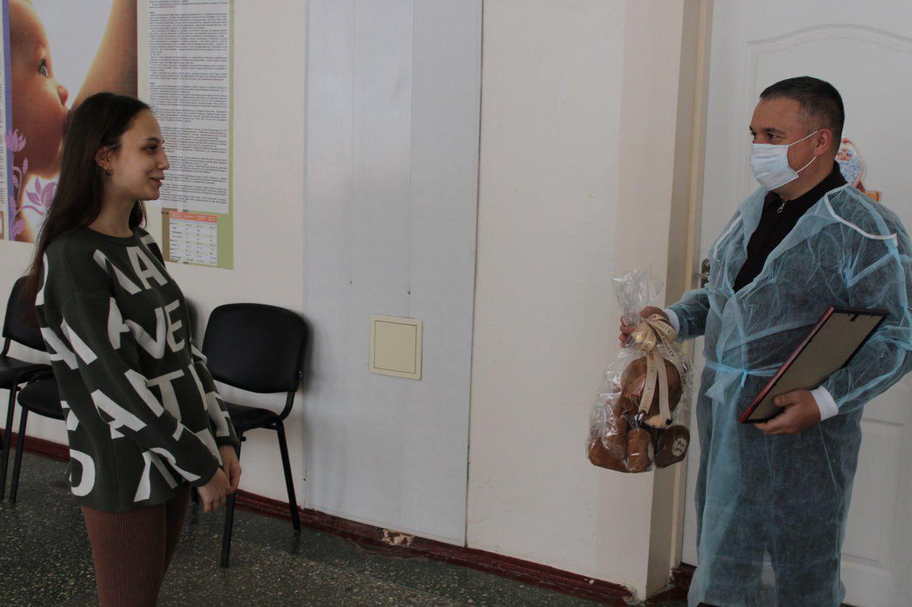 Павел Калиниченко от всей души поздравил Ольгу с приятным событием, вручил ей подарок и Сертификат новорожденного.