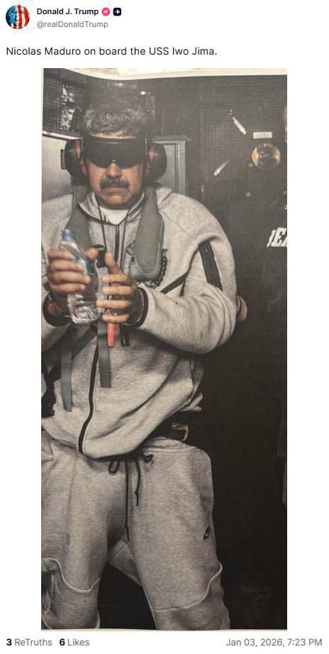 Трамп опубликовал фото захваченного президента Венесуэлы Николаса Мадуро
