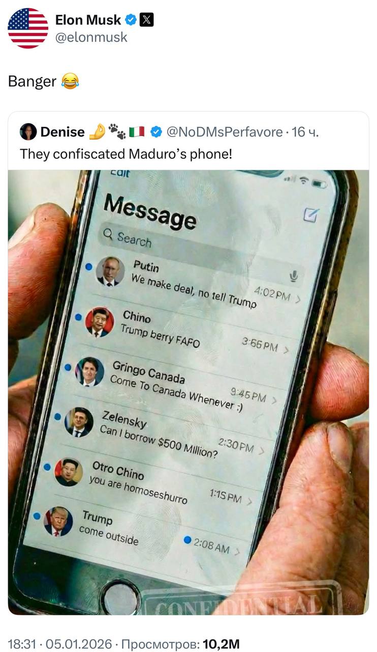 Илон Маск сделал репост шутки про «телефон Мадуро», в котором нашли переписку с Зеленским, где тот просит одолжить ему $500 млн