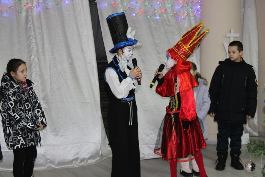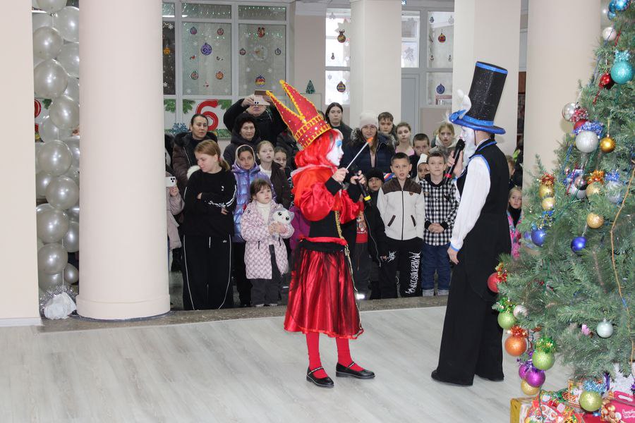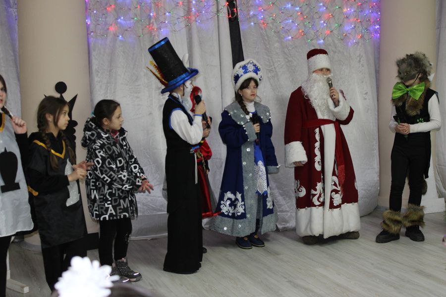 С самого начала театрализованной развлекательной программы «Алиса в стране чудесного Нового года» сказочные персонажи: Королевский Кролик, Чеширский Кот и Красная Королева в исполнении участников театра-студии «Апельсин» (руководитель Снежана Домник) и участники танцевального коллектива «Смайл Денс» (руководитель Анна Магдыч) в образе шахматных фигур перенесли ребят в волшебный мир сказки. Ребята окунулись в атмосферу приключений главных героев и сами стали участниками событий, сопереживали героям и помогали бороться со злом, где, конечно же, стали победителями.