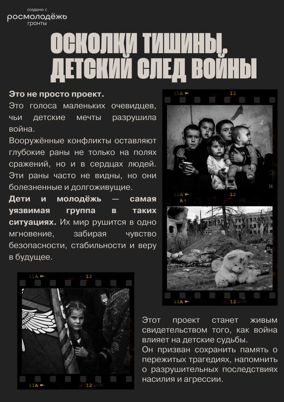 Проект «Осколки тишины. Детский след войны» создан для поддержки детей и молодёжи 12–23 лет, переживших военные события. Через арт-терапию и творчество участники смогут безопасно выразить свои чувства, прожить сложный опыт и быть услышанными — без давления и оценок.