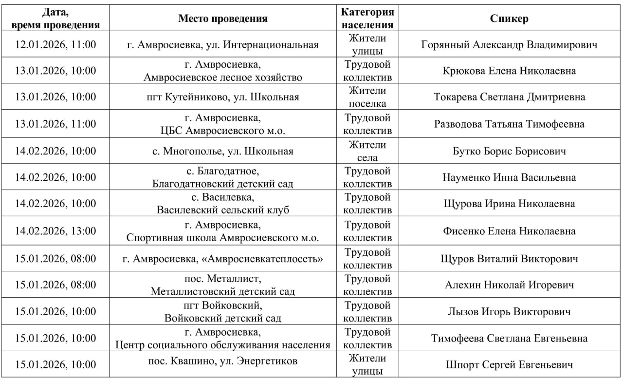 График проведения встреч с населением на подведомственных территориях руководящим составом администрации Амвросиевского муниципального округа, начальниками территориальных отделов администрации округа с 12 по 15 января