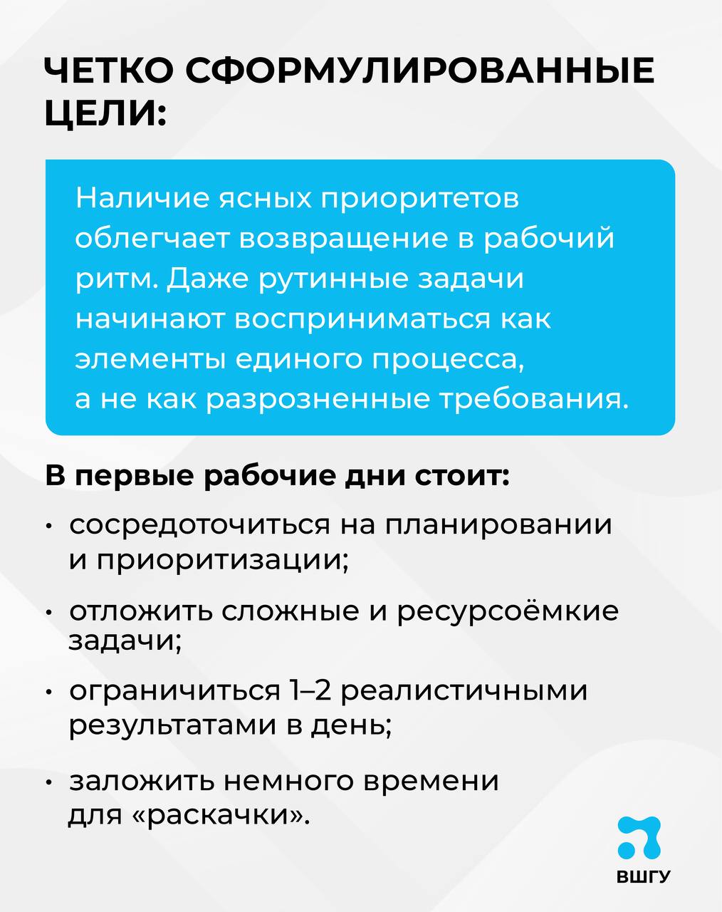По его словам, с точки зрения организационной психологии, человеку проще включаться в деятельность, когда он понимает направление движения и смысл прилагаемых усилий. Поэтому первые рабочие дни нового года представляют собой не столько момент для ускорения, сколько окно возможностей для выстраивания годовых ориентиров и приоритетов.