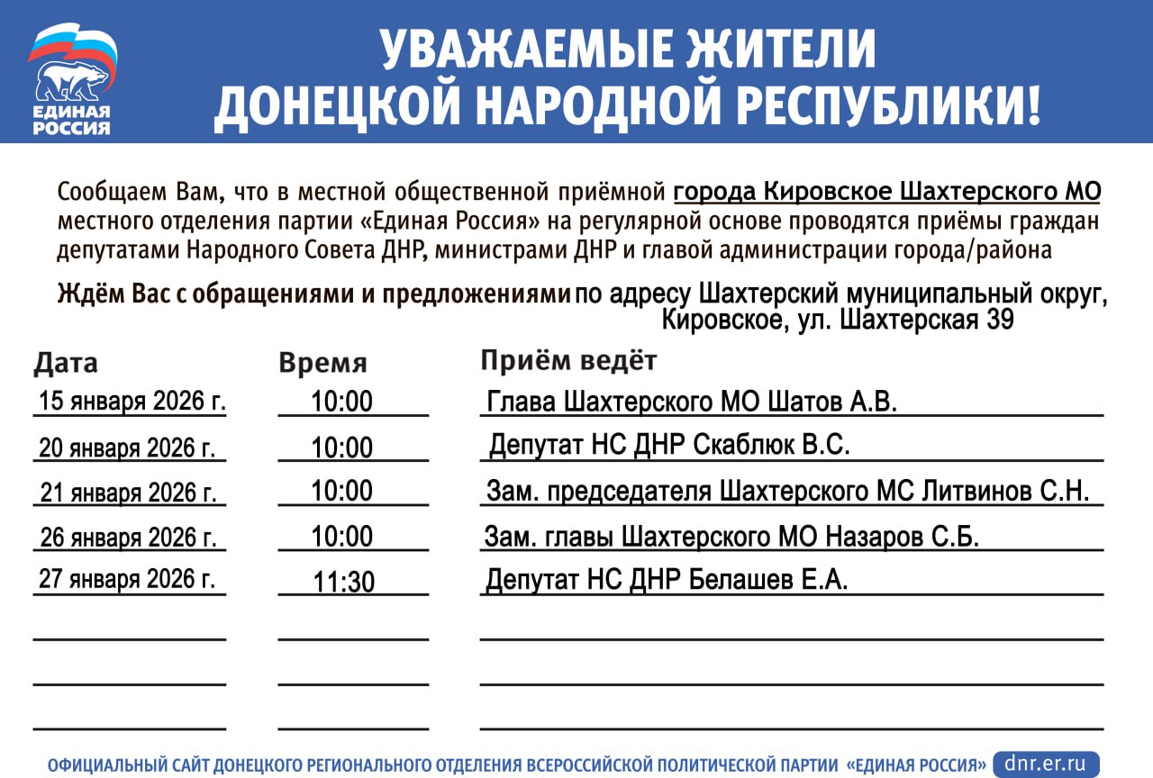 График приема граждан в общественной приемной города Кировское Шахтерского местного отделения партии «Единая Россия» в январе 2026 года