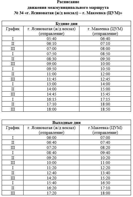 Информируем Вас, что с 15 января 2026 года возобновляется по трём графикам движение межмуниципального маршрута № 34 «г. Ясиноватая (ж/д вокзал) – г. Макеевка (ЦУМ)»: