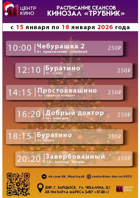 Расписание сеансов в кинотеатрах «Харцызск» и «Трубник» с 15 по 18 января 2026 года