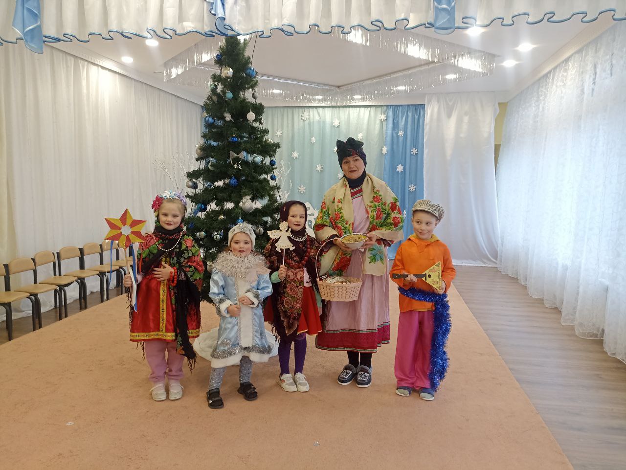 В дошкольном подразделении ГБОУ "Светлодарский УВК г. о. Дебальцево" ежегодно проходят мероприятия, которые знакомят детей с традициями, обрядами святочных праздников на Руси. У детей старших дошкольных групп фольклорный праздник "Святки" начался с задорного колядования и добрых пожеланий, которые звучали под аккомпанемент музыки. Дети и сотрудники в нарядных костюмах с удовольствием пели веселые песни, водили хороводы, с азартом участвовали в народных играх. Но, пожалуй, самым приятным моментом для малышей стали сладкие угощения и теплые слова благодарности, которые они услышали.