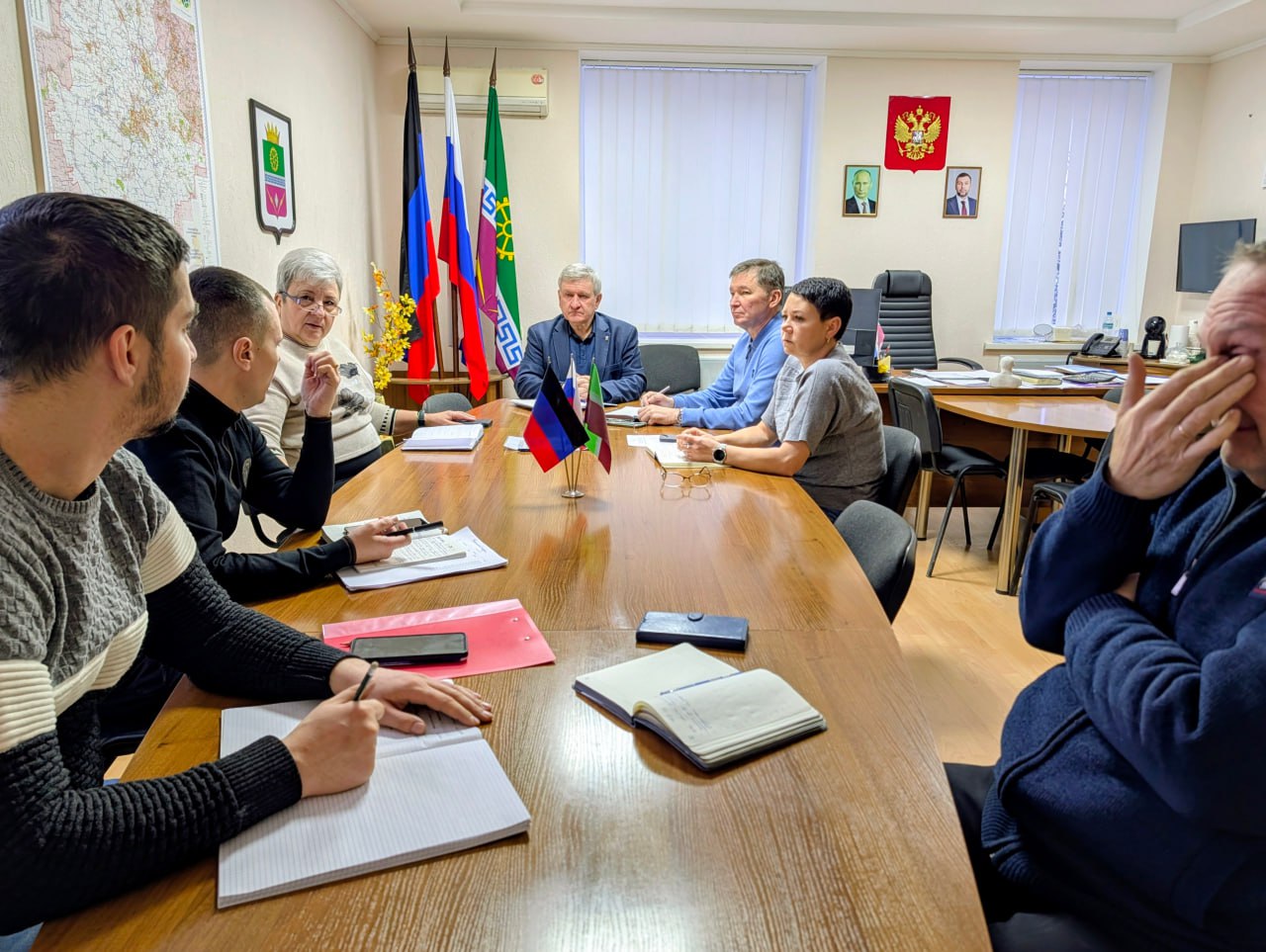 Провел оперативное совещание по текущим вопросам. Обсудили ситуацию в округе, доложили о выполнении данных ранее поручений, определили первостепенные задачи на сегодня, дал соответствующие поручения.