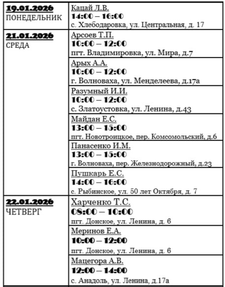 График личного приема граждан депутатами Волновахского муниципального совета Донецкой Народной Республики с 19.01. по 23.01.2026 года