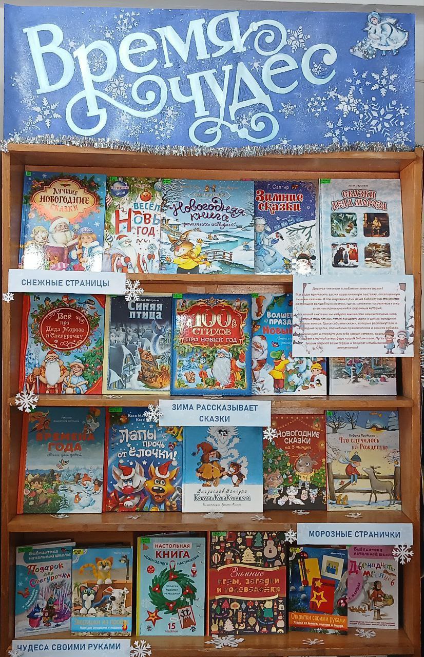 Ребята смогли окунуться в мир чудес и волшебства, узнать много интересного о самом волшебном времени года – зиме. На книжной выставке представлены: сказки известных детских писателей, герои которых весело и увлекательно встречают Новый Год, весёлые стихи про Деда Мороза, Снегурочку, зимние игры, загадки и головоломки. А еще вы сами сможете стать волшебниками, сделав чудеса из картона, бумаги, бисера и других материалов. В этом вам помогут книги Киры Малецкой «Настольная книга новогоднего настроения» и М. Форлина «Открытки своими руками».