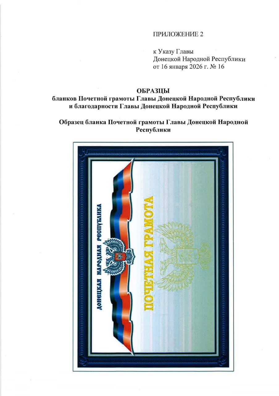 Утверждены Положение о Почетной грамоте и благодарности Главы ДНР, их образцы и описание бланков.